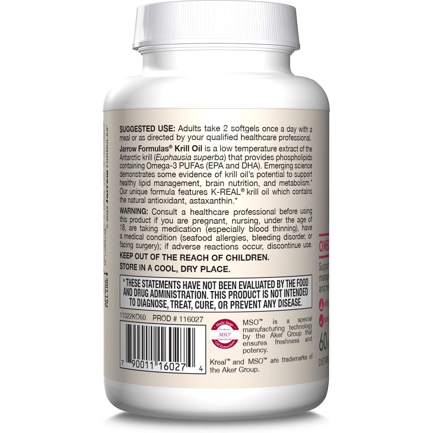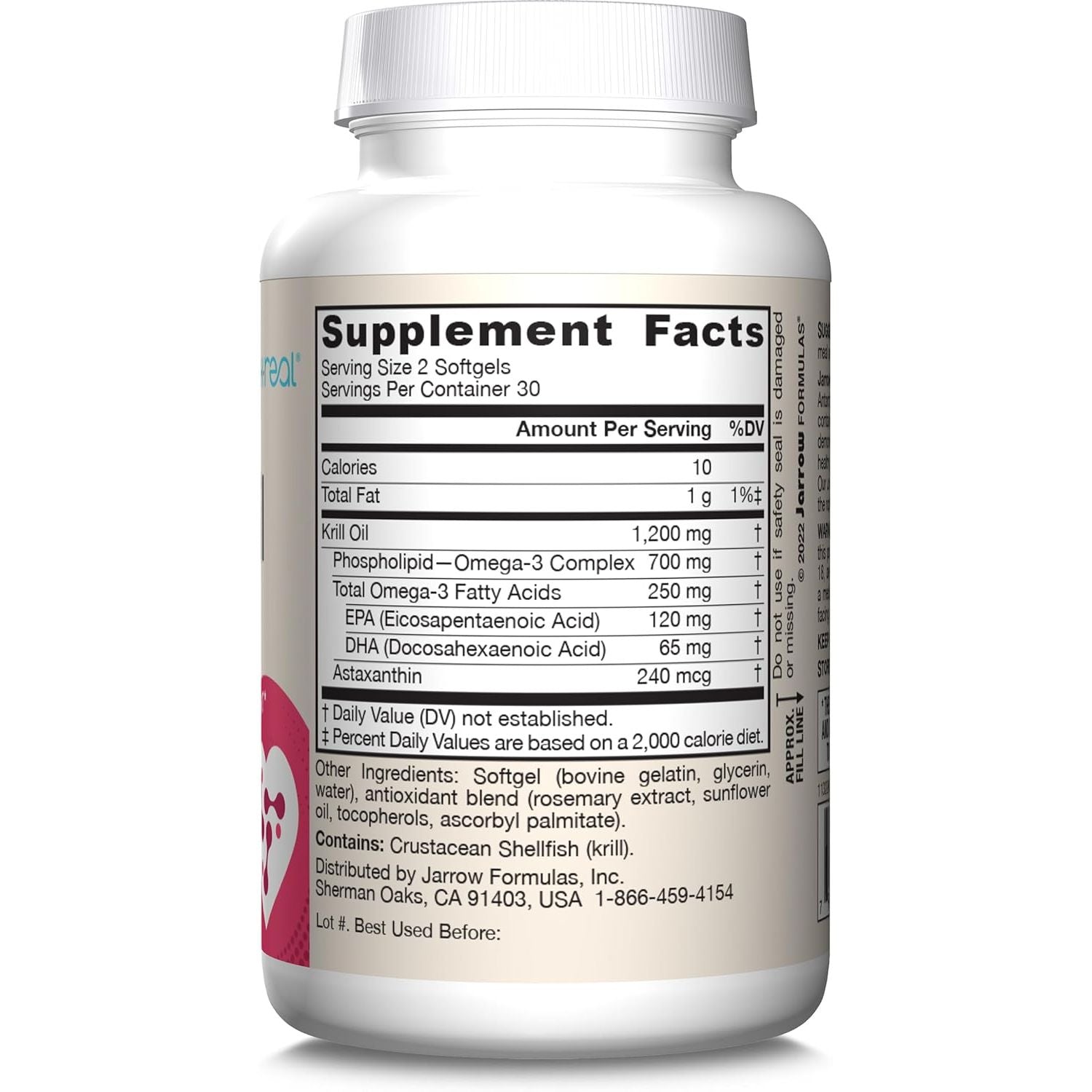 Jarrow Formulas Krill Oil is a low-temperature extract of Antarctic krill (Euphausia superba). This formula also contains astaxanthin and phospholipid, an omega-3 complex that contains omega-3 fatty acids, EPA, and DHA. Each serving of Jarrow Formulas Krill Oil provides a potent amount of unique phospholipids featuring in omega-3 phospholipids (EPA and DHA), 1200 mg krill oil, 700 mg omega-3 complex, 250 mg Total omega-3 fatty acids, 120 mg EPA, 70 mg DHA, and 240 mcg astaxanthin. Krill Oil is included for lipid management to support overall metabolic and heart health.* Krill Oil contains ultra-potent marine phospholipids, which support cognitive abilities, memory, and overall mental acuity.* Krill Oil has shown potential in improving metabolism and the liver's ability to respond to dietary challenges, supporting metabolic health.* Our Krill Oil contains the antioxidant astaxanthin, which helps protect your body's cells from oxidative stress. Krill Oil is non-GMO, gluten free, dairy free, soy free, and egg free. Suggested use: Adults take 2 softgels per day with a meal or as directed by your qualified healthcare professional. *These statements have not been evaluated by the Food and Drug Administration. This product is not intended to diagnose, treat, cure or prevent any disease.