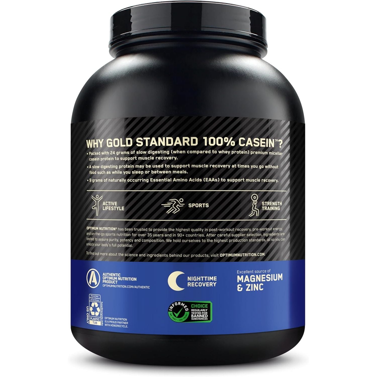 Optimum Nutrition Gold Standard 100% Micellar Casein Protein Powder helps support muscle recovery. Made with micellar casein, this protein shake powder ensures that you're getting high quality protein with every serving. With nearly 9 grams of naturally occurring Essential Amino Acids per serving, this protein powder drink supports recovery, making it ideal for use between meals and before bedtime. Each serving of this delicious Chocolate Supreme-flavored powder is an excellent source of zinc, magnesium and calcium and provides 24 grams of protein. Optimum Nutrition powder mixes easily using a shaker cup or blended in a smoothie. There are 53 servings in this 3.97 pound container. Gold Standard 100% Casein from Optimum Nutrition, the World's #1 Sports Nutrition Brand.* *Source Euromonitor International Limited; Consumer Health 2023 Edition, Sports Nutrition category, %retail value shares, 2022 data.