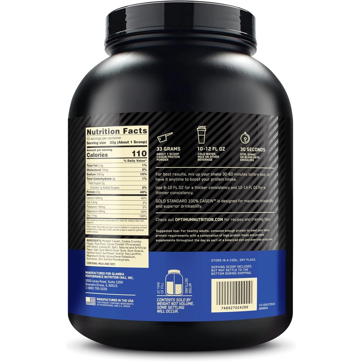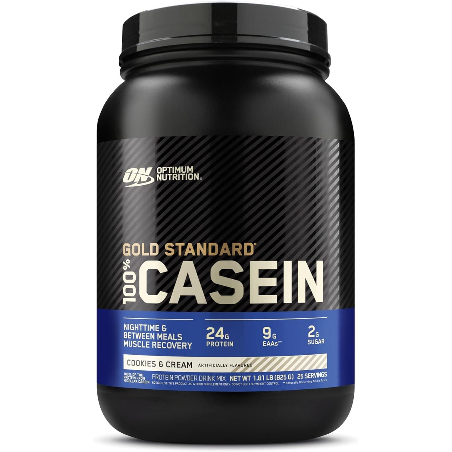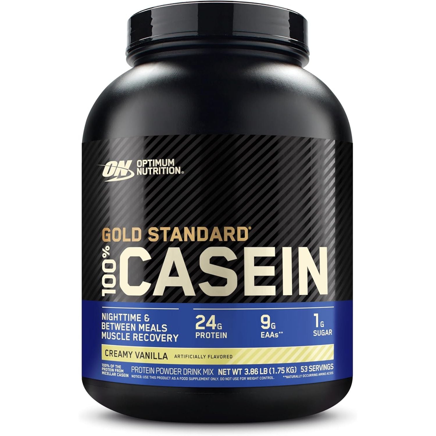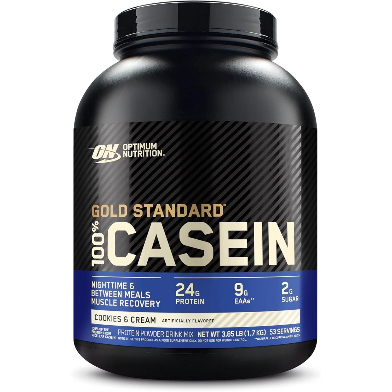 - One 3.86 lb container (53 servings) of Optimum Nutrition Gold Standard 100% Micellar Casein Protein Powder in Cookies and Cream flavor