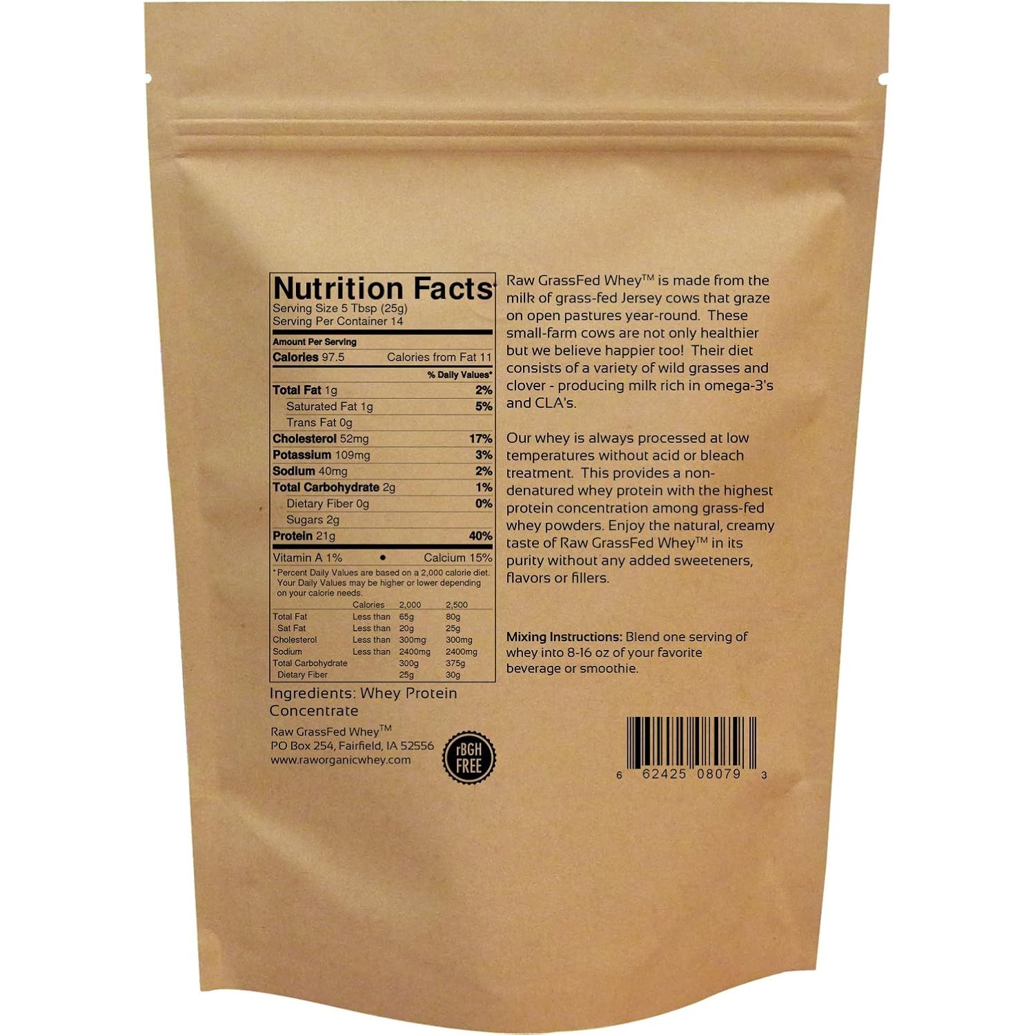VOTED WORLD'S CLEANEST WHEY! - 100% COLD PROCESSED RAW GRASS FED WHEY PROTEIN FROM HAPPY HEALTHY COWS Our jersey cows graze freely on lush, green pastures year round. These small-farm cows are not only healthier but we believe happier too! Their diet consists of a variety of wild grasses and clover - producing milk rich in omega-3s and CLAs. The result is a deliciously creamy whey protein that has the highest protein concentration among natural grass-fed whey powders. Cold Processed Raw Grass Fed Whey Raw Grass Fed Whey is minimally processed at low temperatures and is higher in antioxidants and other nutrients than conventional whey powders. Superior quality begins with what the cows eat and how they live, which is why our whey is sourced from jersey cows that are grass-fed on small family farms in the US. We ensure that these cows are raised without hormones, antibiotics, steroids, or genetically modified feed (Non-GMO). Raw Grass Fed Whey tastes so amazing by itself, we don't add any sweeteners, flavors or fillers - just 100% grass fed whey protein! Raw Grass Fed Whey: ONLY 1 INGREDIENT: 100% Pure Grass Fed whey NON-GMO, A2 Milk, Soy Free, rBGH/rBST Hormone Free, Gluten Free, Grass Fed Contains no artificial sweeteners or flavors Processed WITHOUT acid or bleach Sourced from Grass Fed Free Range Cows Sourced 100% from US Sustainable Small Farms Heavy Metal Free