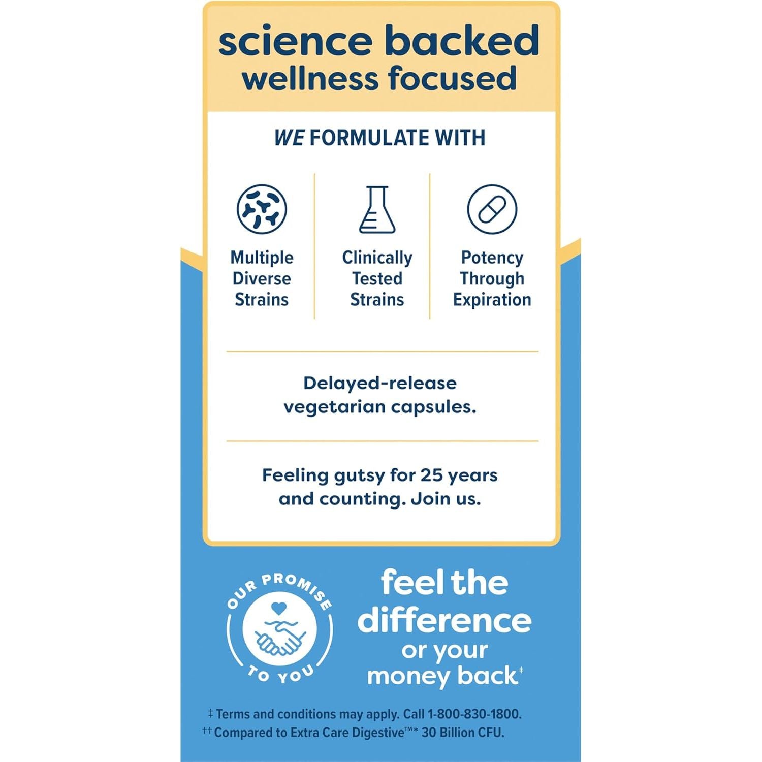 Renew Life Extra Care Digestive Probiotic offers 12 diverse strains in easy-to-swallow capsules to promote digestive, immune and respiratory health and includes L. rhamnosus GG, the No. 1 most-studied strain.(1) With 50 billion guaranteed live cultures, these Renew Life probiotic capsules make it easy to support digestive, respiratory and immune health. Our probiotics include clinically tested strains formulated by microbiologists and researchers to offer science-backed health benefits you can enjoy every day. Potency, quality and purity are guaranteed through the expiration date. Our probiotic capsules use delayed-release technology, which protects probiotics from harsh stomach conditions as they make their way through your body, helping your probiotics reach your gut alive. This Non-GMO Project Verified daily probiotic supplement comes in small, easy-to-swallow capsules that are gluten-free, dairy-free and soy-free. Renew Life puts health and wellness first with supplements that are backed by over 25 years of clinical research.(2) (1) L. rhamnosus GG strain, PubMed Clinical Trials, September 2021 (2) These statements have not been evaluated by the Food and Drug Administration. This product is not intended to diagnose, treat, cure or prevent any disease.