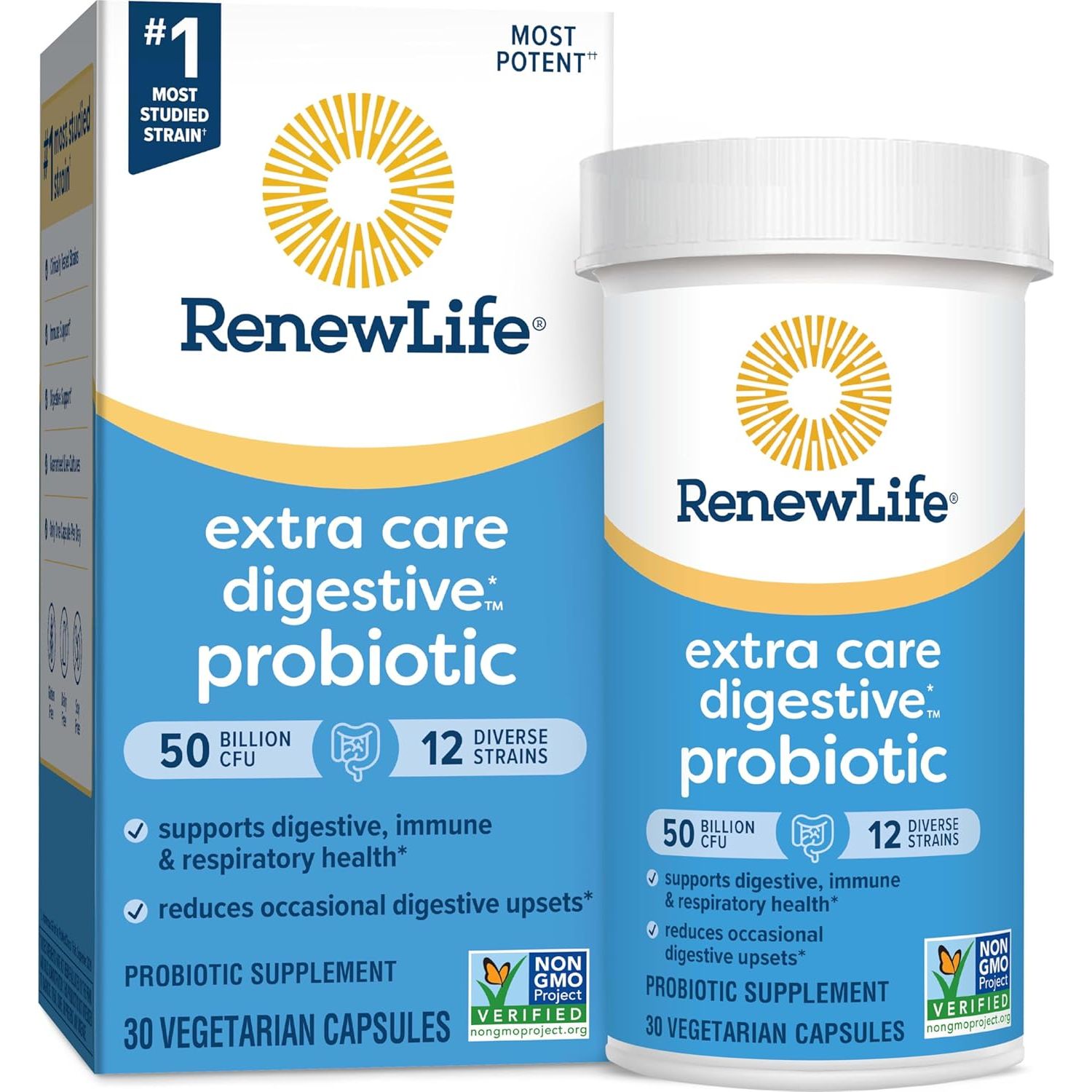 - Renew Life Extra Care Digestive Probiotic Capsules, 50 Billion CFU Guaranteed, Daily Supplement Supports Immune, Digestive, Respiratory Health(1), L. Rhamnosus GG, Dairy, Soy and Gluten-Free, 30 Count