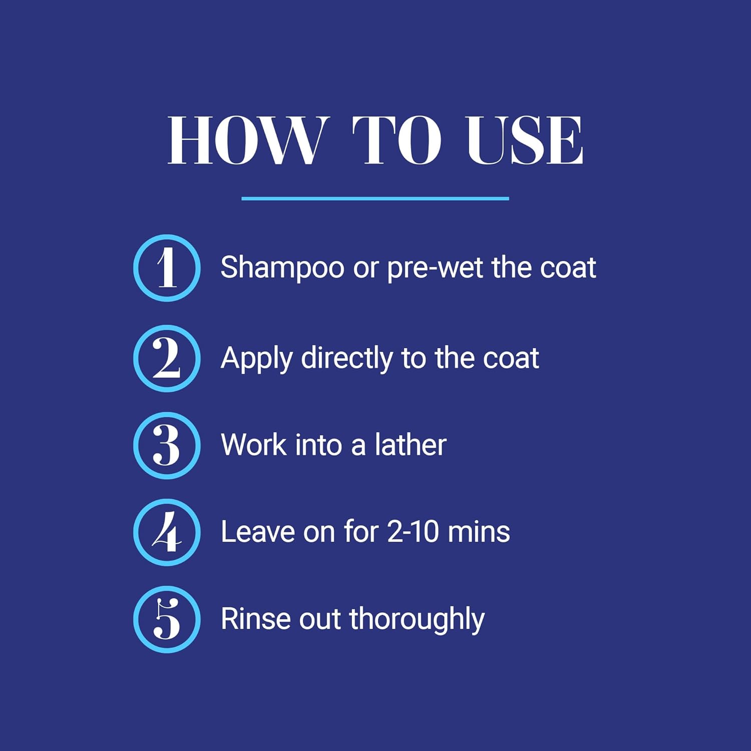 Apply undiluted directly to the coat. Work into a lather and allow to remain for 2-10 minutes depending on the porosity and texture of the coat.