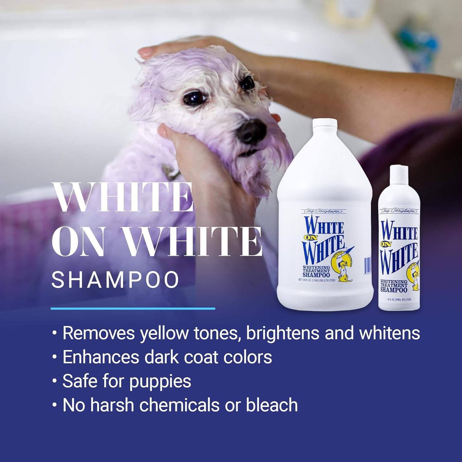 - DOG WHITENING SHAMPOO – Chris Christensen White on White Dog Shampoo gets the yellow out! This product is an optic intensifying treatment within a shampoo, removing all yellow stains, and will also enhance darker colors, leaving a luscious sheen. It brightens and whitens the coat while maintaining the coat’s texture. The result is a stain-free, brilliant, dazzling coat that’s soft to the touch. Available in two sizes; 16 fl. oz for at-home use and a gallon for professional use.