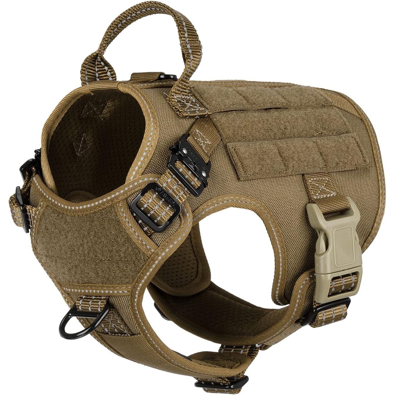 - [Molle /PALs Compatible ] :1" Strips of Molle ( Small: 3 x Hook & 2 x Loop ;Medium:4 x Hook & 2 x Loop,Large/X-large: 5 x Hook & 2 x Loop ) are Sewn Onto each Side,Allowing Your Dog to Carry Gears in Training / Daily Walking/Adventure Hiking, Compatible with Molle /PALs bags,You Can Aslo attach a Dog Bowl,Water Bottle, and toys using D-shaped carabiners (carabiners not included)