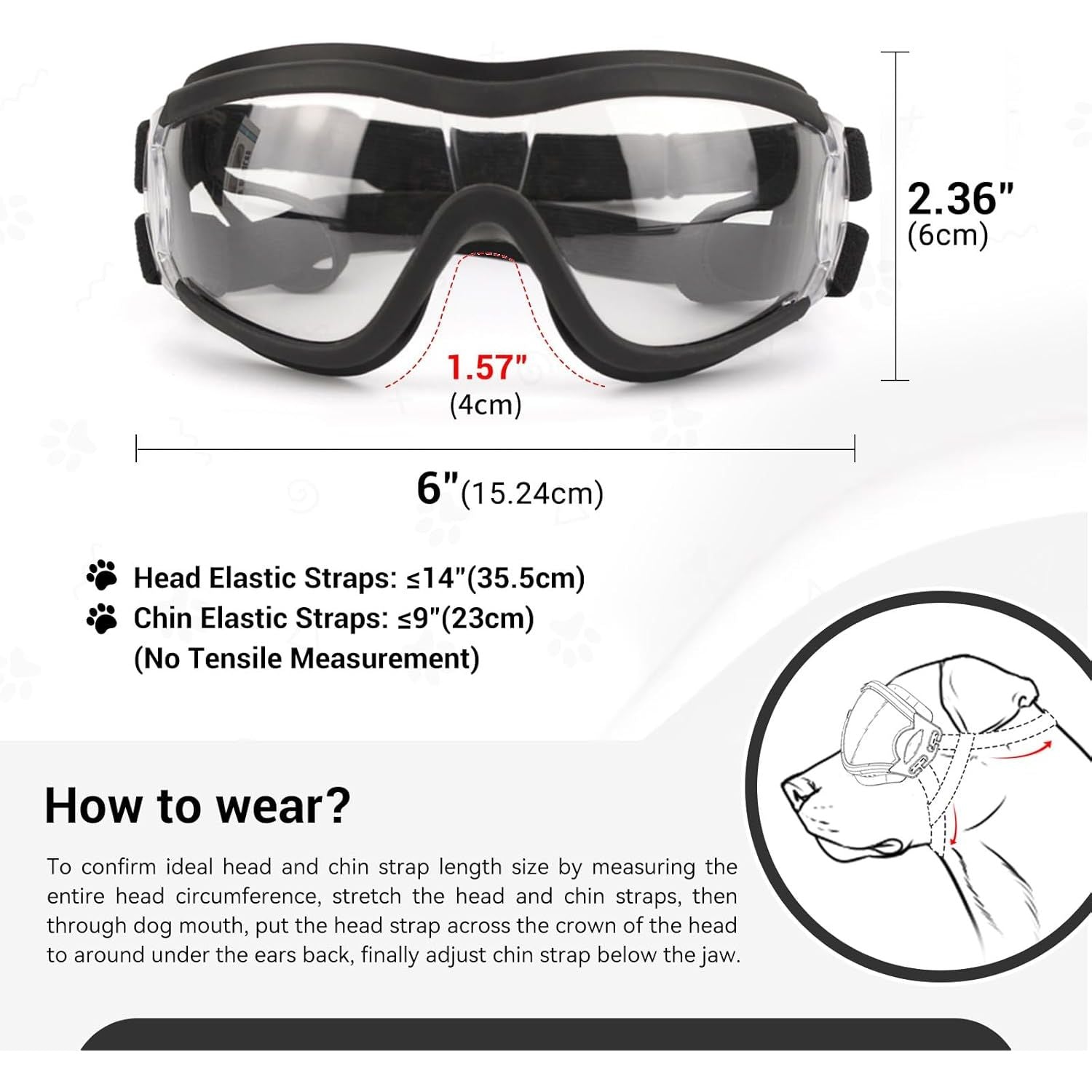 - Frame Length: 6"(15.24cm), Height: 2.36"(6cm). Head Elastic Straps: ≤14", Chin Elastic Straps: ≤9". (No Tensile Measurement) Adjust straps after putting on to avoid glasses slipping off and hurting dog eyes.