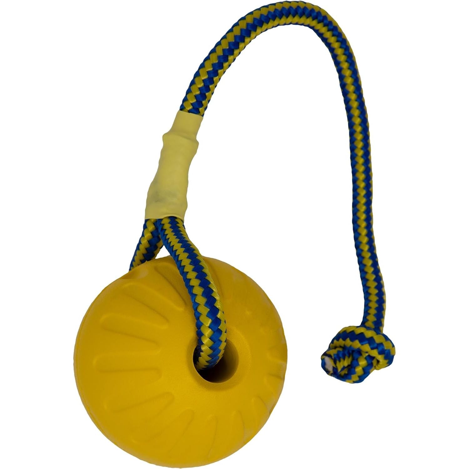 Our virtually indestructible foam ball is now available on a rope. Made from a patented strong foam material that is soft and safe in dogs' mouths. Floats in water and great bounce.