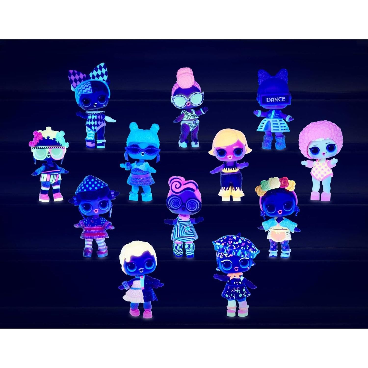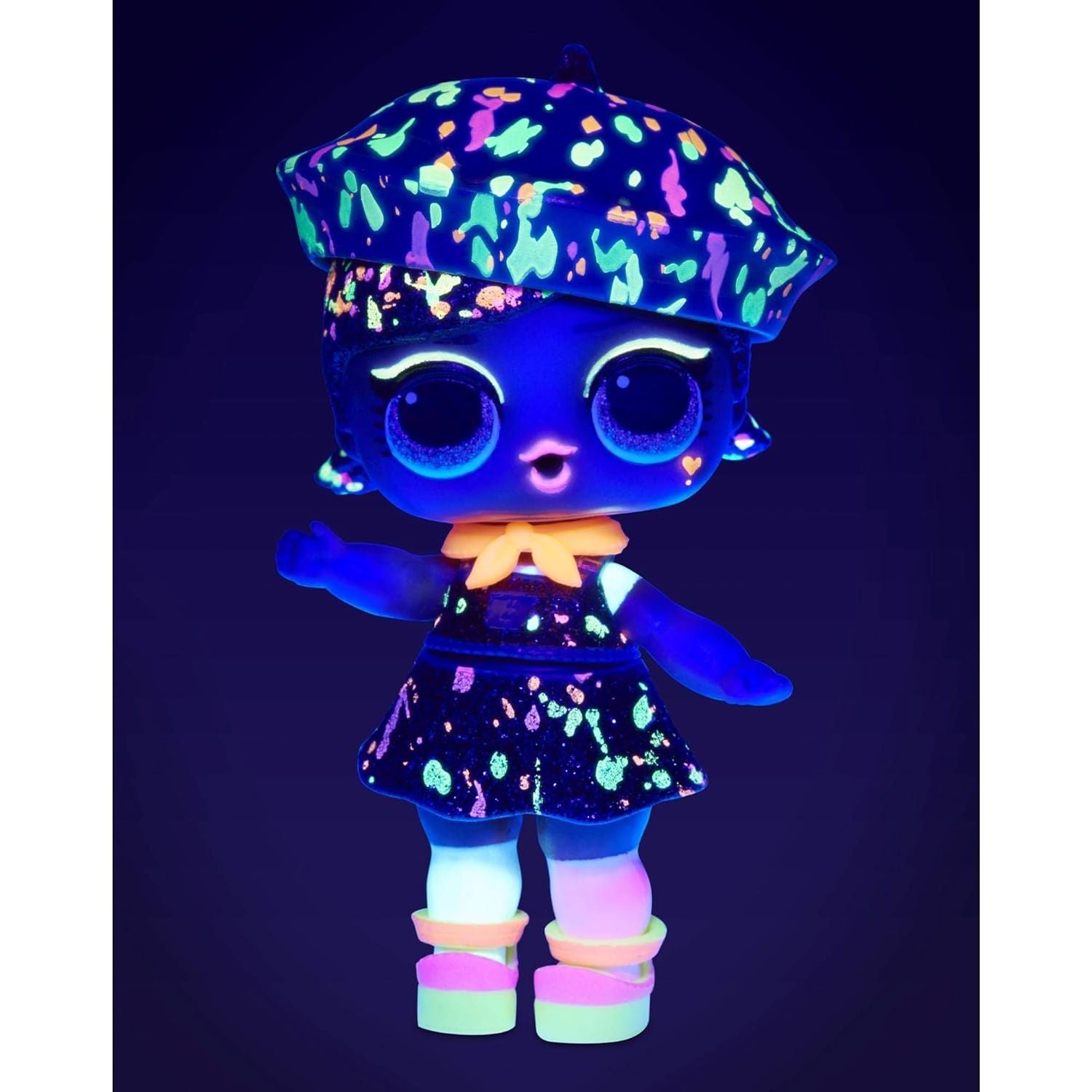 - Unbox 8 surprises, including a sparkly doll with black light surprises.