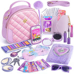 - 👑47PCS ALL INCLUSIVE PLAY PURSE SET: A complete kid purse set includes everything your little girl wish to have: 1 toy purse, 1 unicorn eye mask, 1 plush diary, 1 pom pom pen, 1 wallet holds 25pcs play money and 6 uniquely designed play cards (driving license, credit card, salon VIP card, grocery gift card, health care card, donut card), 1 sunglasses, 1 car key fob, key rings w/ 3 keys, 1 toy cellphone, 1 hairbrush, pretend Makeups (lipstick, cushion foundation, eyeshadow and mascara).