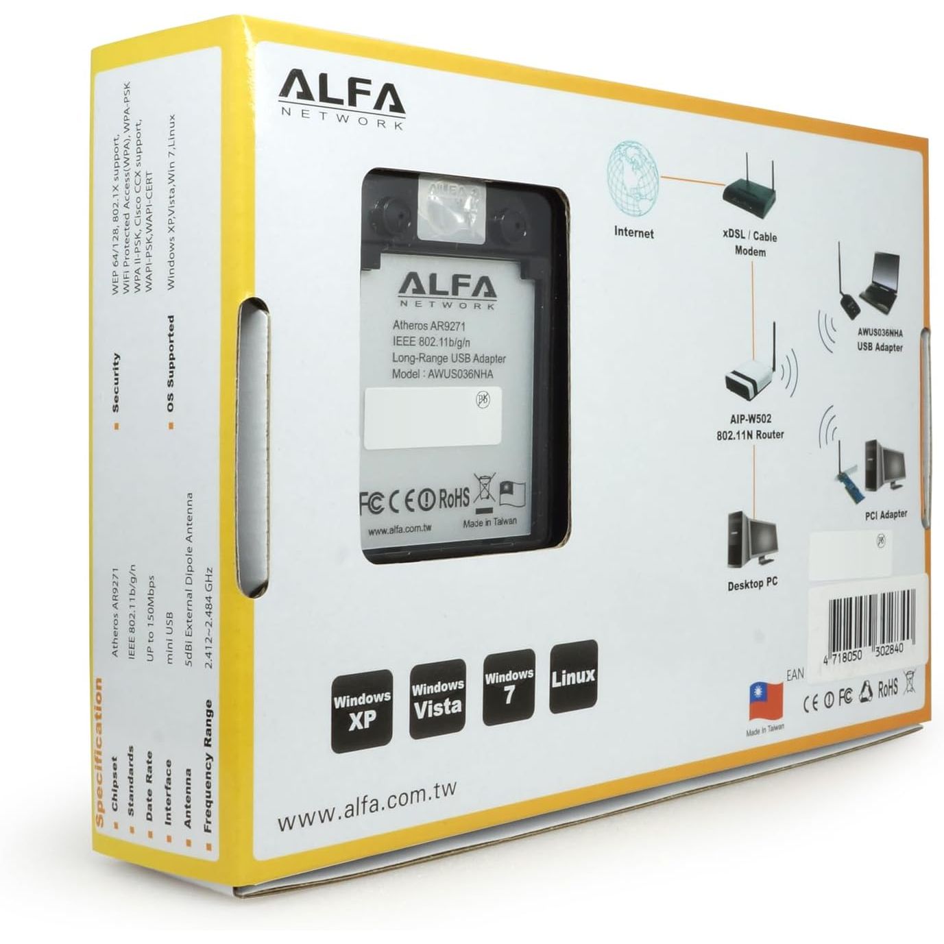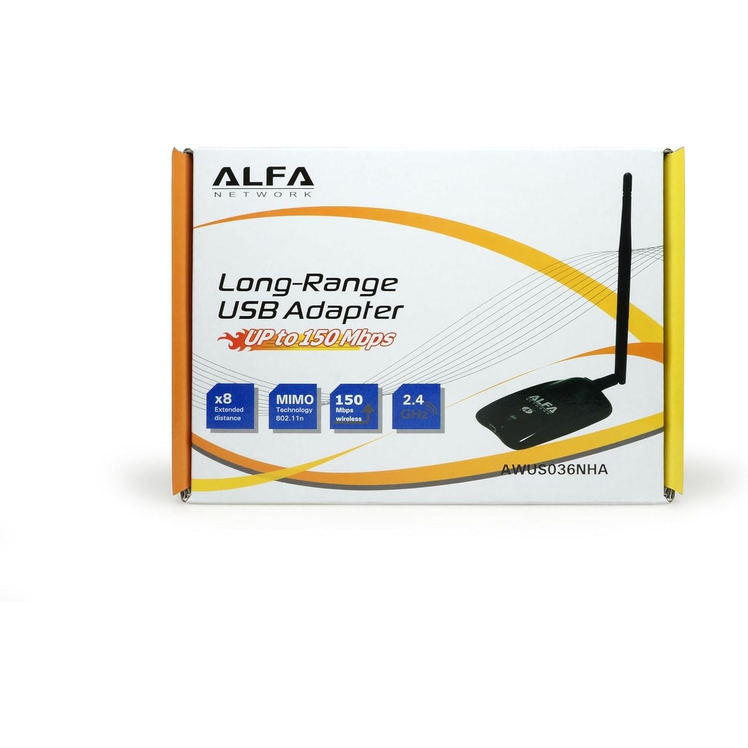 - ALFA AWUS036NHA Wireless B/G/N USB Adaptor - 802.11n - 150 Mbps - 2.4 GHz - 5 dBi Antenna - Long Range - Atheros Chipset - Windows XP/Vista 64-Bit/128-Bit Windows 7 Compatible, TAA Compliant
