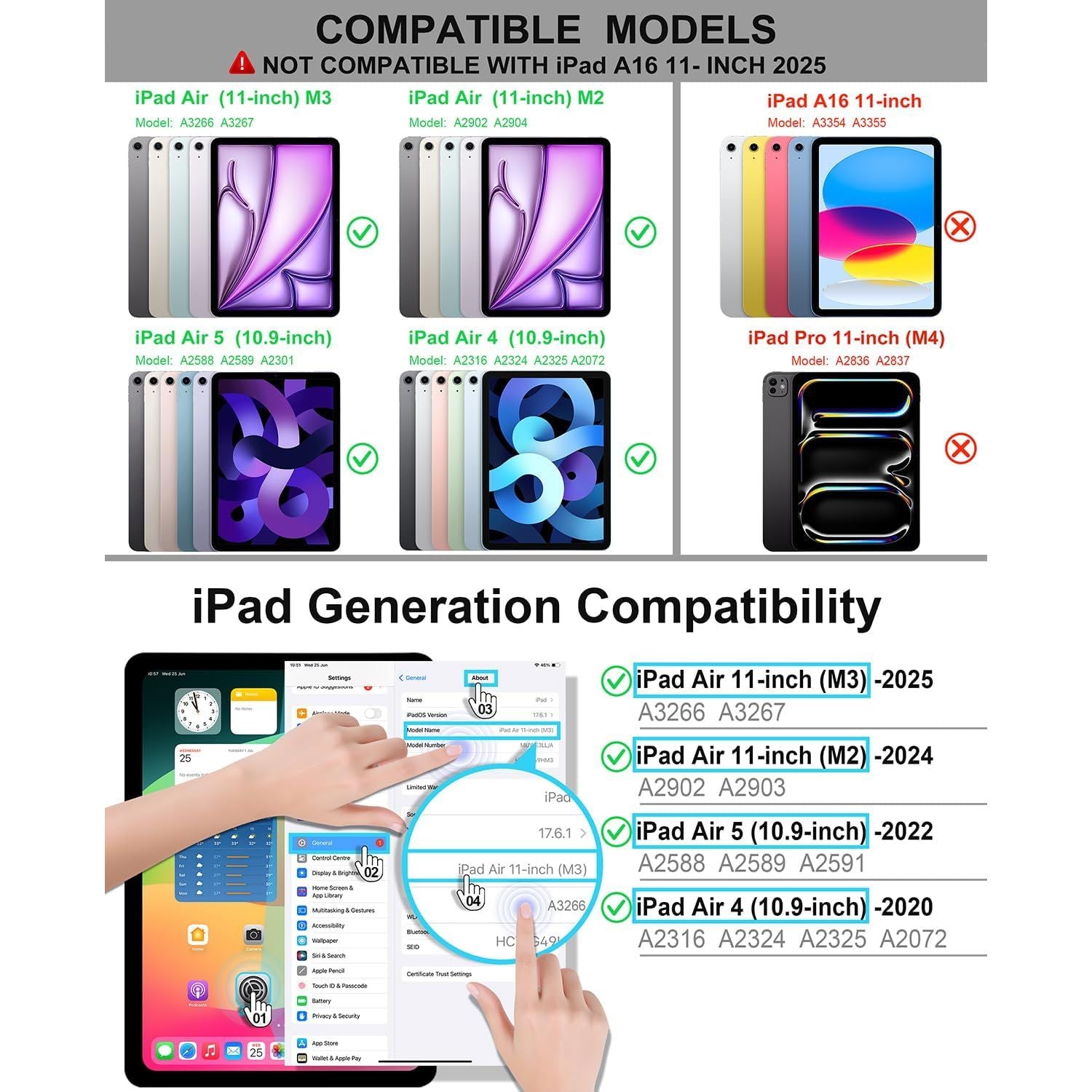 - Compatibility: For iPad Air 11-inch (M3) 2025 (Model: A3266/A3267), For iPad Air 11-inch (M2) 2024 (Model: A2902/A2903). for iPad Air 5th Generation (Model Number: A2588/A2589/A2591), for iPad Air 4th Generation 10.9 inch (Model Number: A2316/A2324/A2325/A2072). Not for any other models. Please check the model number No. "AXXXX" the bottom of the back of your tablet to confirm correct size before purchasing.