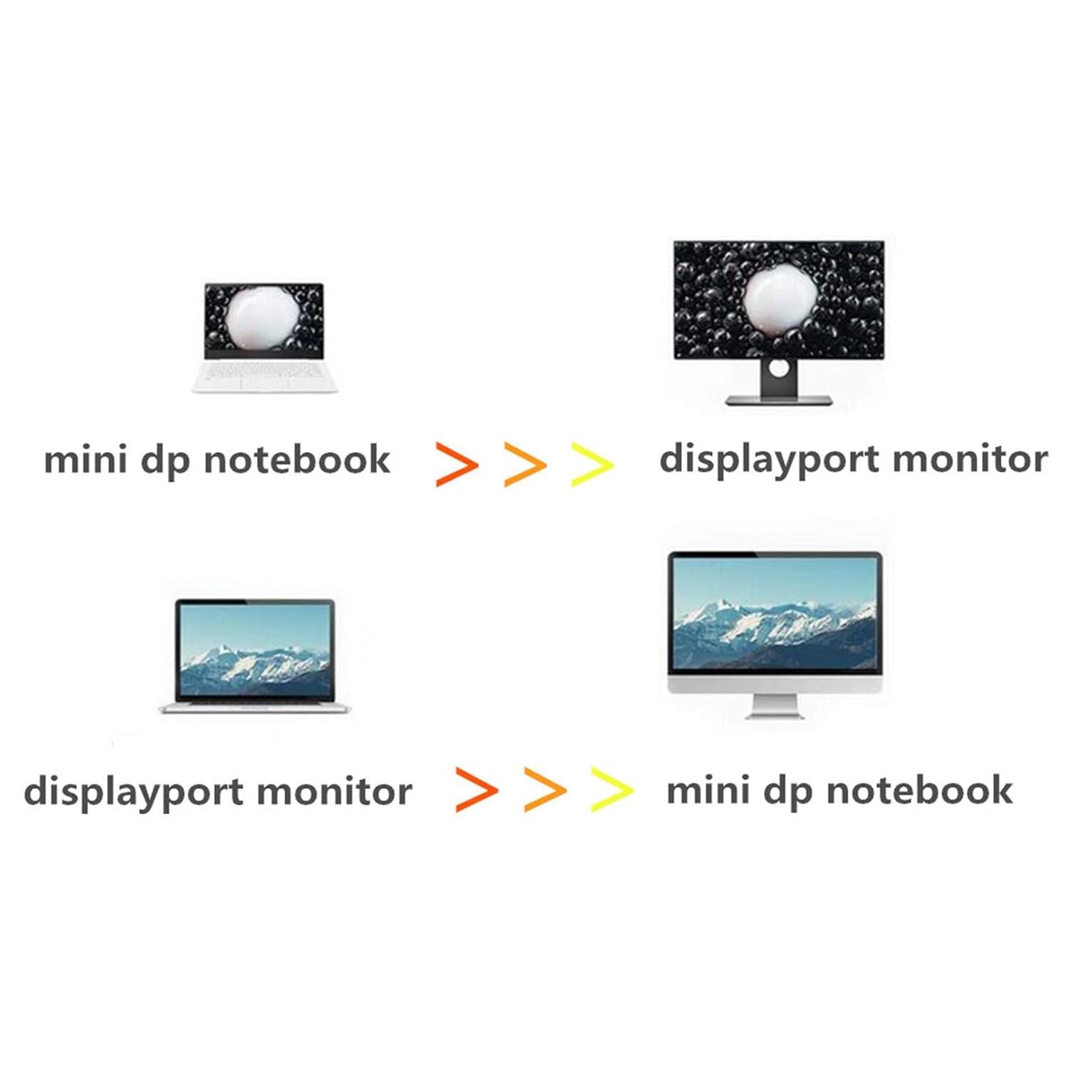 - Bi-Directional Transmission Mini DP DisplayPort 8K Cable,This cable supporting Bi-Directional Transmissions,both supporting transfering from your mini dp laptops to your displayport displays and from your displayport computers to your mini displayport displays.Note:If you would like to output from your DisplayPort Laptops to your Mini DisplayPort Monitors,your Monitor's Mini DP Port must support Video Transmitting.