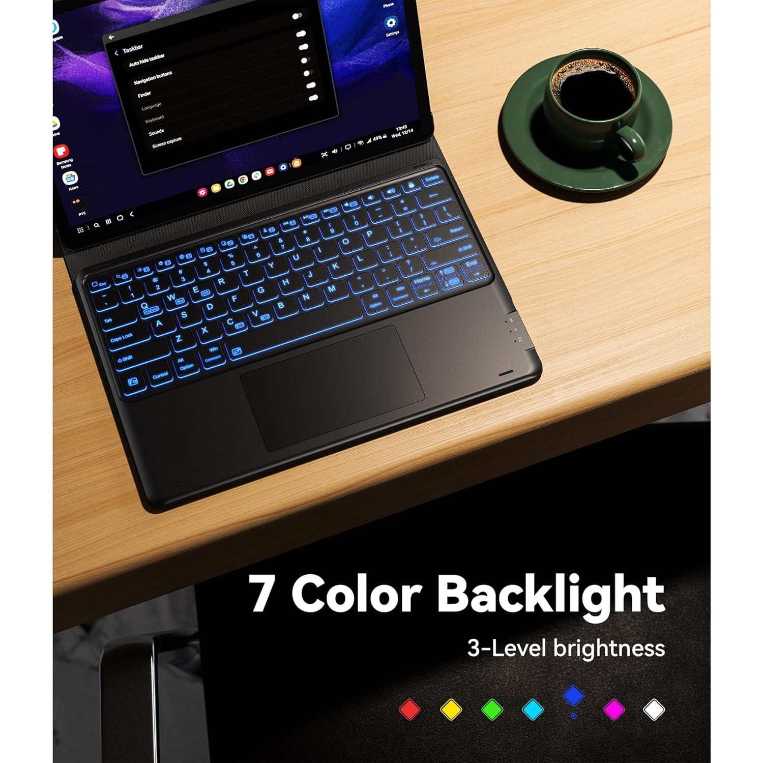 - [7-Color Backlit]: This Galaxy Tab S9 plus keyboard case with seven distinct backlight colors provides a spectrum of choices to match the ambient lighting of the environment. The three levels of brightness adjustment add more versatility, ensuring that the backlighting can be set to a comfortable intensity for any setting.