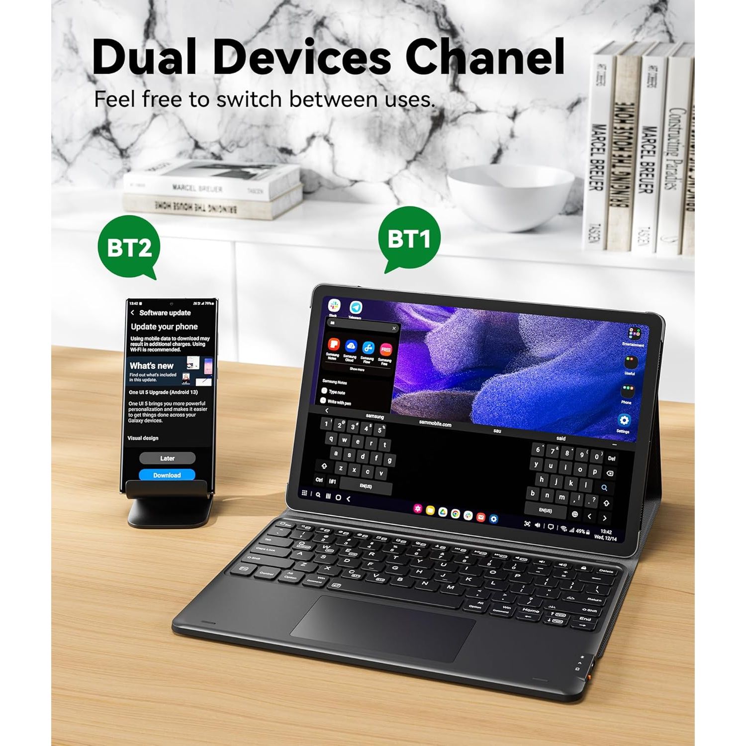 - [Dual Devices Channel]: The tab s9 plus keyboard case is equipped with dual device channels, meaning it can connect to and switch between two devices seamlessly. This makes it ideal for those who may need to operate both a tablet and another BT-enabled device.