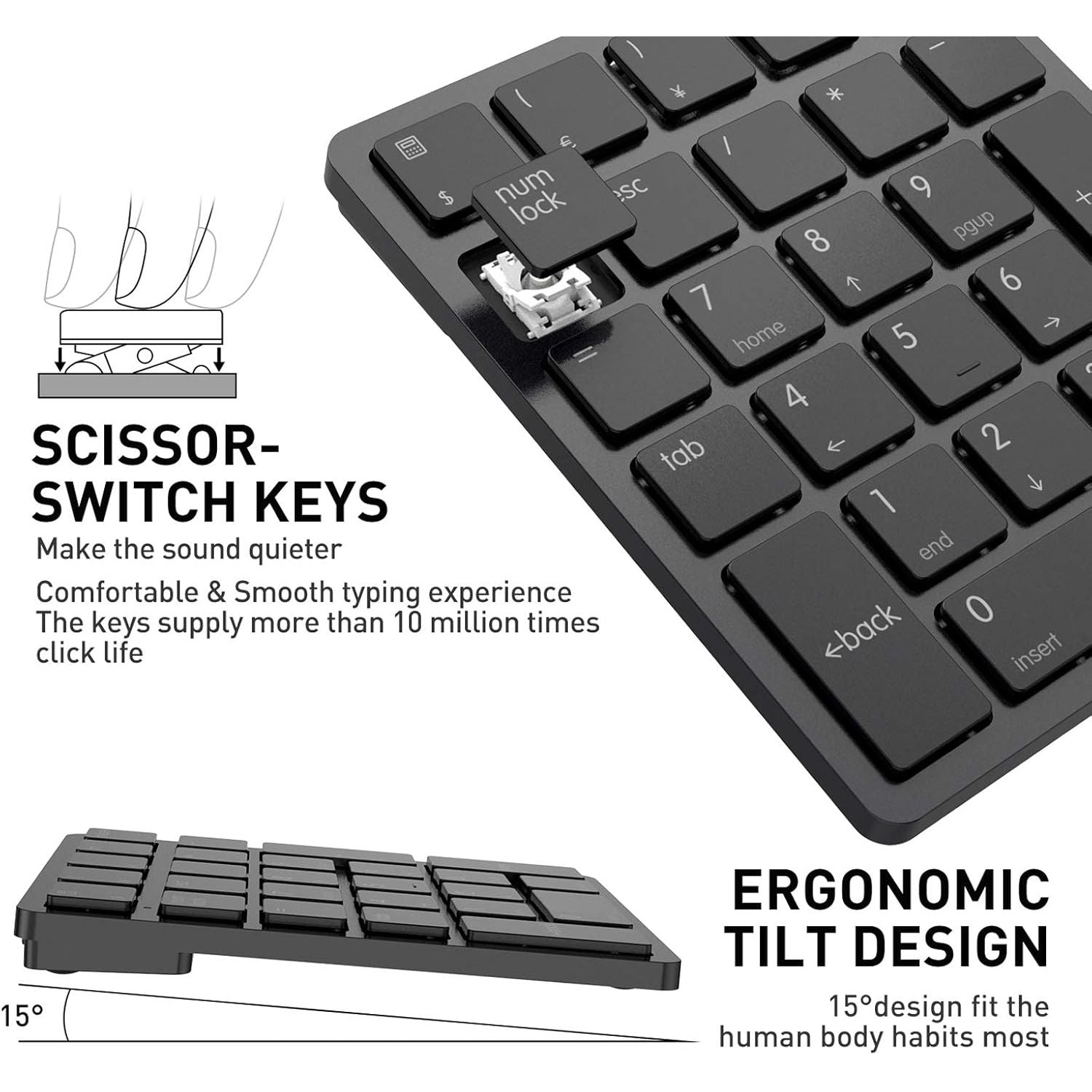 - Comfortable Numeric Pad: With quiet SCISSOR-SWITCH KEYS provides a comfortable and smooth typing experience, quick response and good tactile rebound, keep the office quiet and improve work efficiency.15° tilt design fits the human body habits, great for spreadsheets worker, accounting staff and financial officer