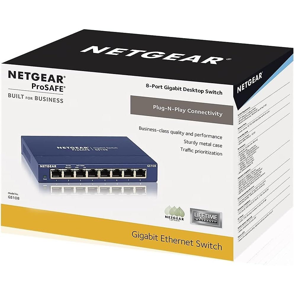 The NETGEAR GS108 Unmanaged Desktop Switch features 8-Ports Gigabit Ethernet, ProSAFE Lifetime Protection and more.