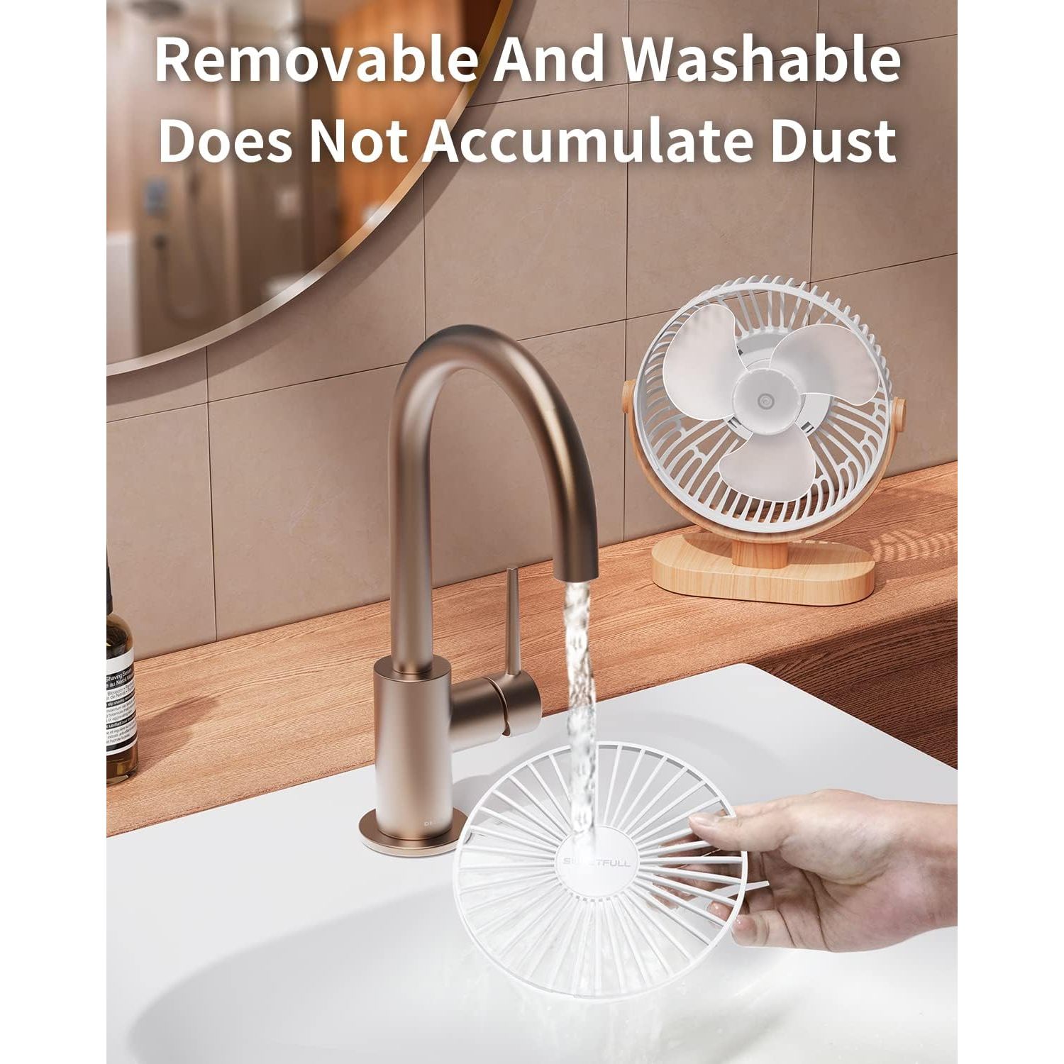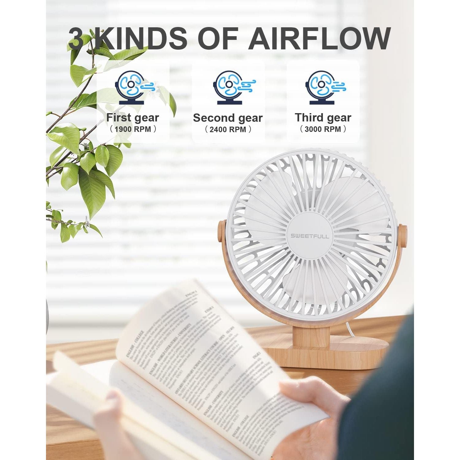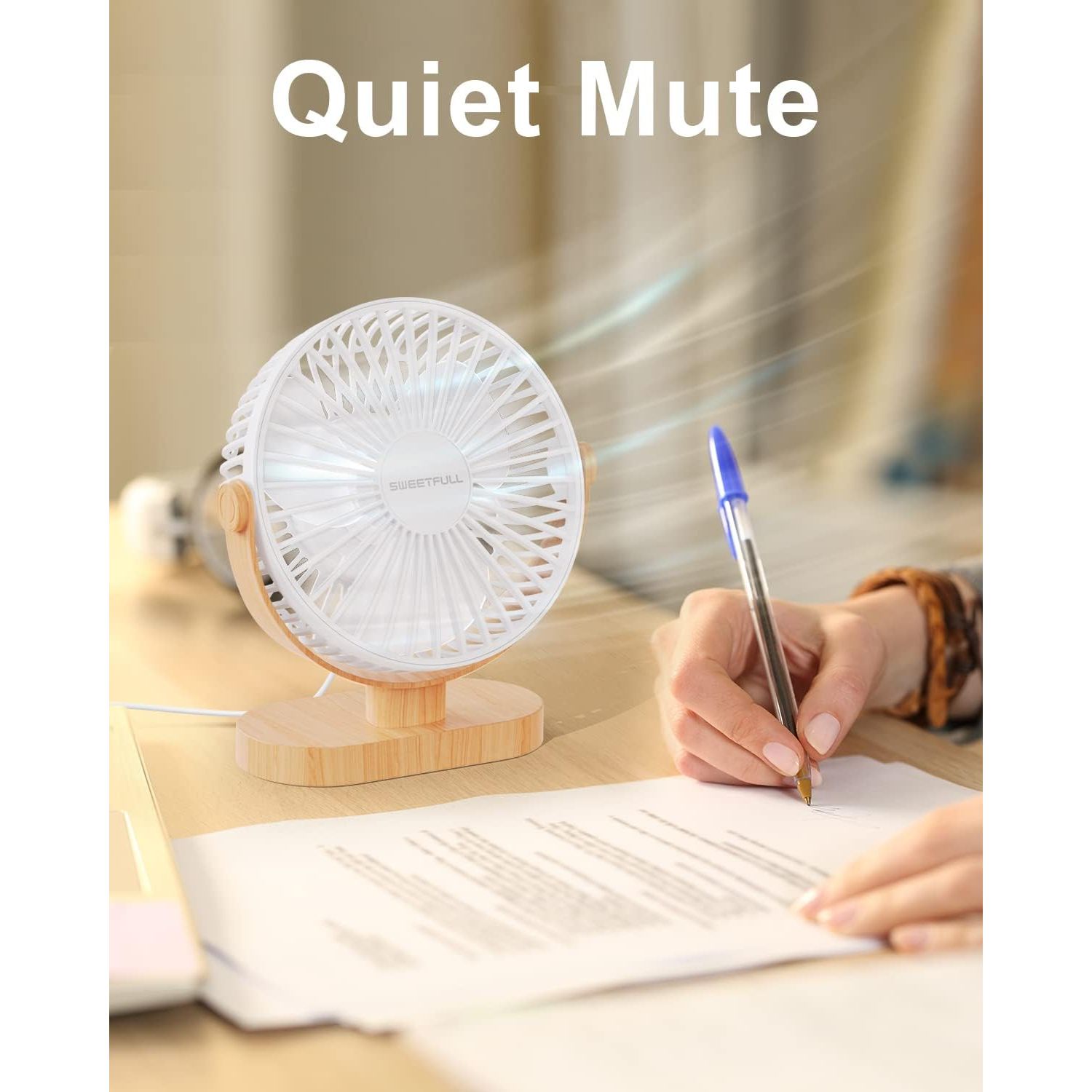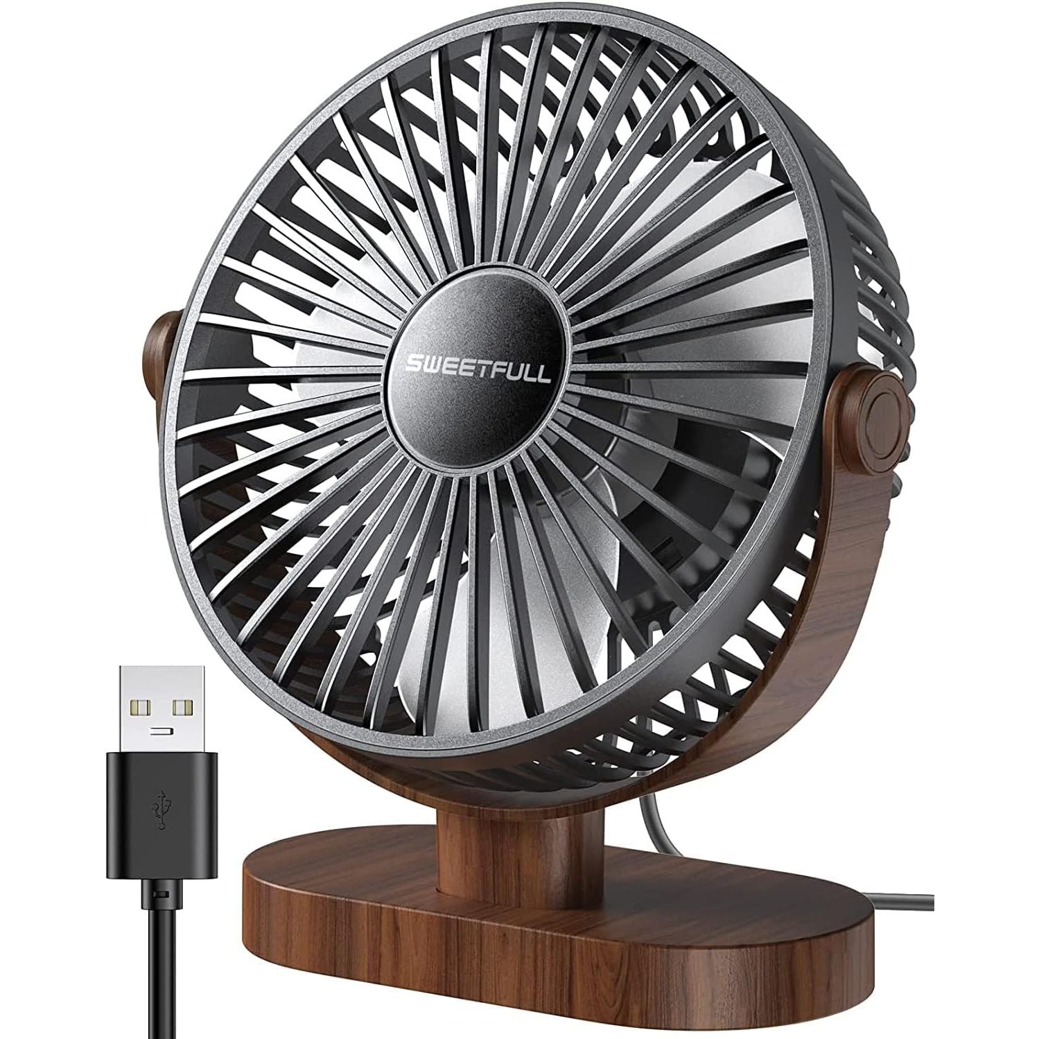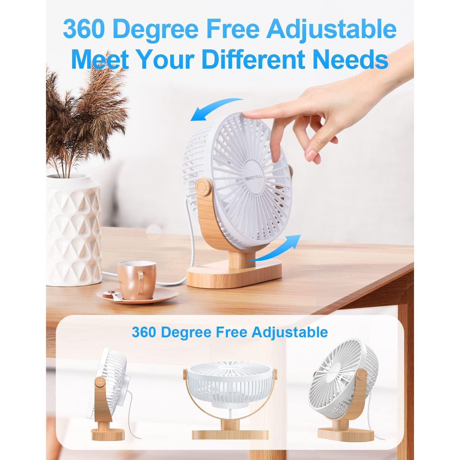 - SWEETFULL Small USB Desk Fan 6.5 Inch, 3 Speeds Portable Personal Desktop Table Fan, Dual 360° Adjustment Mini Fan, Quiet Operation, for Home Office Car Outdoor Travel (White wood grain)