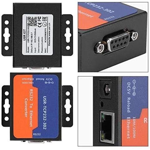 USR-TCP232-302 is a low-cost serial device server,whose function is to realize bidirectional transparent transmission between RS232 and Ethernet. Features of RS232 Ethernet Server Support DHCP, automatically obtain an IP address and query IP address through serial setting protocol Support DNS function Set parameters through webpage Upgrade firmware via network Auto-MDI/MDIX, RJ45 port with 10/100Mbps Serial port baud rate from 600 bps to 230.4 Kbps, Check bit of None, Odd, Even, Mark and Space Work mode: TCP Server, TCP Client, UDP Client, UDP Server, HTTPD Client Support virtual serial port and provide corresponding software USR-VCOM Heartbeat package mechanism to ensure connection is reliable, put an end to dead link User-defined registration package mechanism, check connection status and use as custom packet header Under TCP Server mode, Client number ranges from 1 to 16; default number is 4 The global unique MAC address bought from IEEE, user can define MAC address Restore factory default Across the gateway, switches, routers Can work in LAN, also can work in the Internet (external network) Provide PC TCP/IP socket programming example such as VB,C++,Delphi,Android and IOS Support customization Application Field of RS232 Ethernet Server Industrial data transmission, industrial automation security and protection monitoring, public security Smart home, power control, environmental monitoring, intelligent agriculture Door check on work attendance system, POS system, rice selling system Building automation system, power monitoring, self-service banking system, telecom machine room monitoring Package includes: 1* RS232 to TCP IP Converter 1* Power Adapter