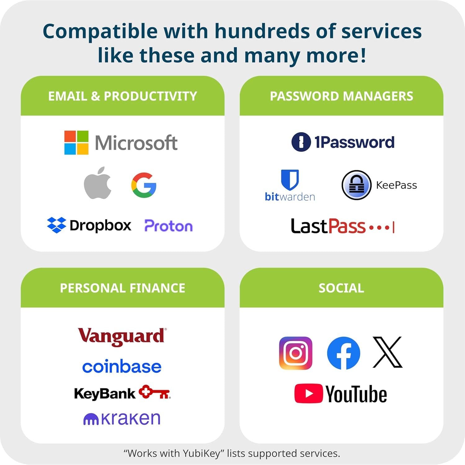 - PASSKEY PROTECTION EVERYWHERE: Works with over 1,000 services, including Google, Microsoft, and Apple. A single YubiKey 5C NFC secures 100+ of your favorite accounts, including email, social media, password managers, gaming, crypto, and more.