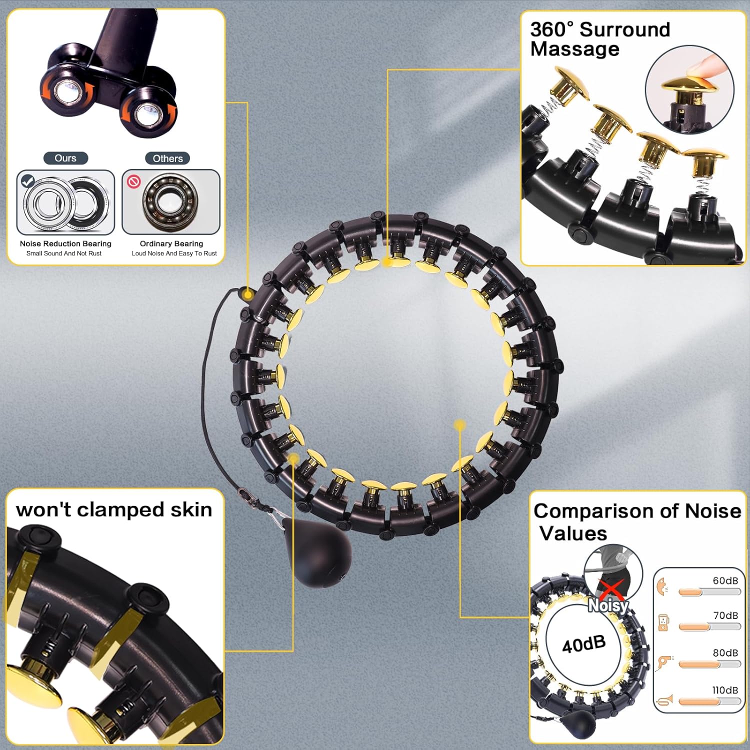 - Easy to use:360-degree shock-absorbing massage ring allows you to exercise comfortably and relieve the pain in the lower back that has been sitting for a long time. The smart hoop is easier to use and will never fall, even beginners can use it