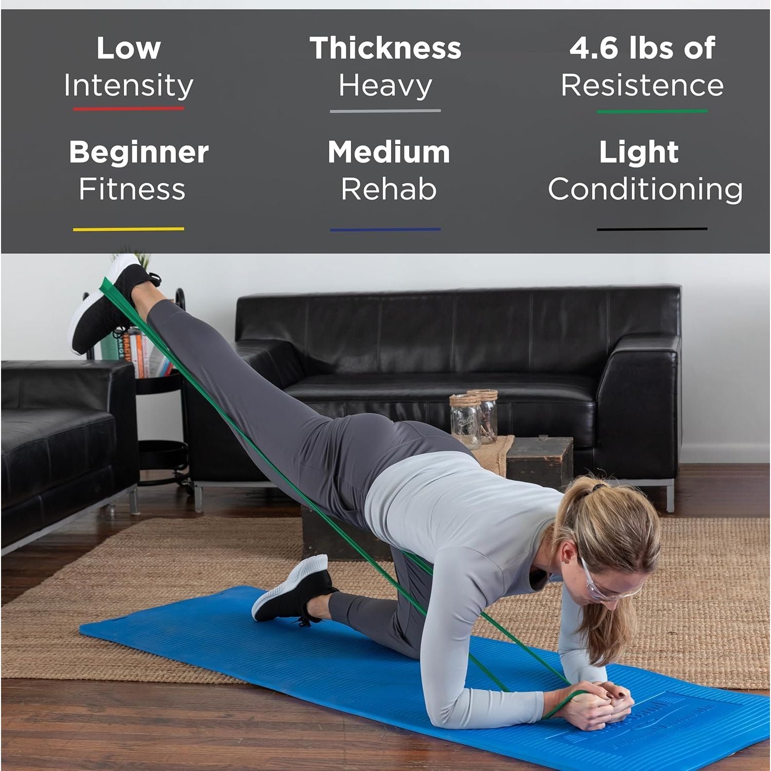 - Each band measures 5 feet long x 4 inches wide and comes in three color-coded resistance levels: Yellow-3-4.3 lbs.; Red-3.7-5.5 lbs.; Green-4.6-6.7 lbs.