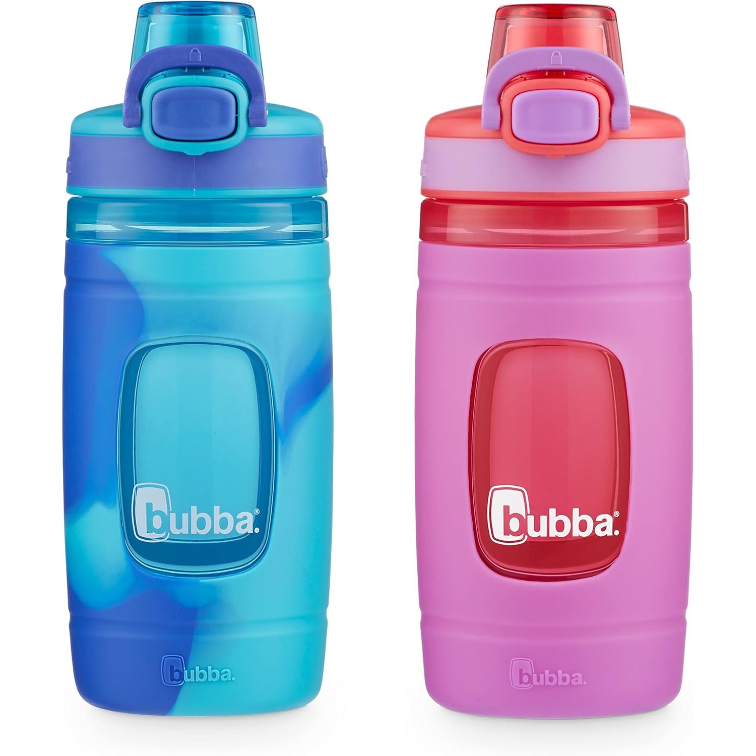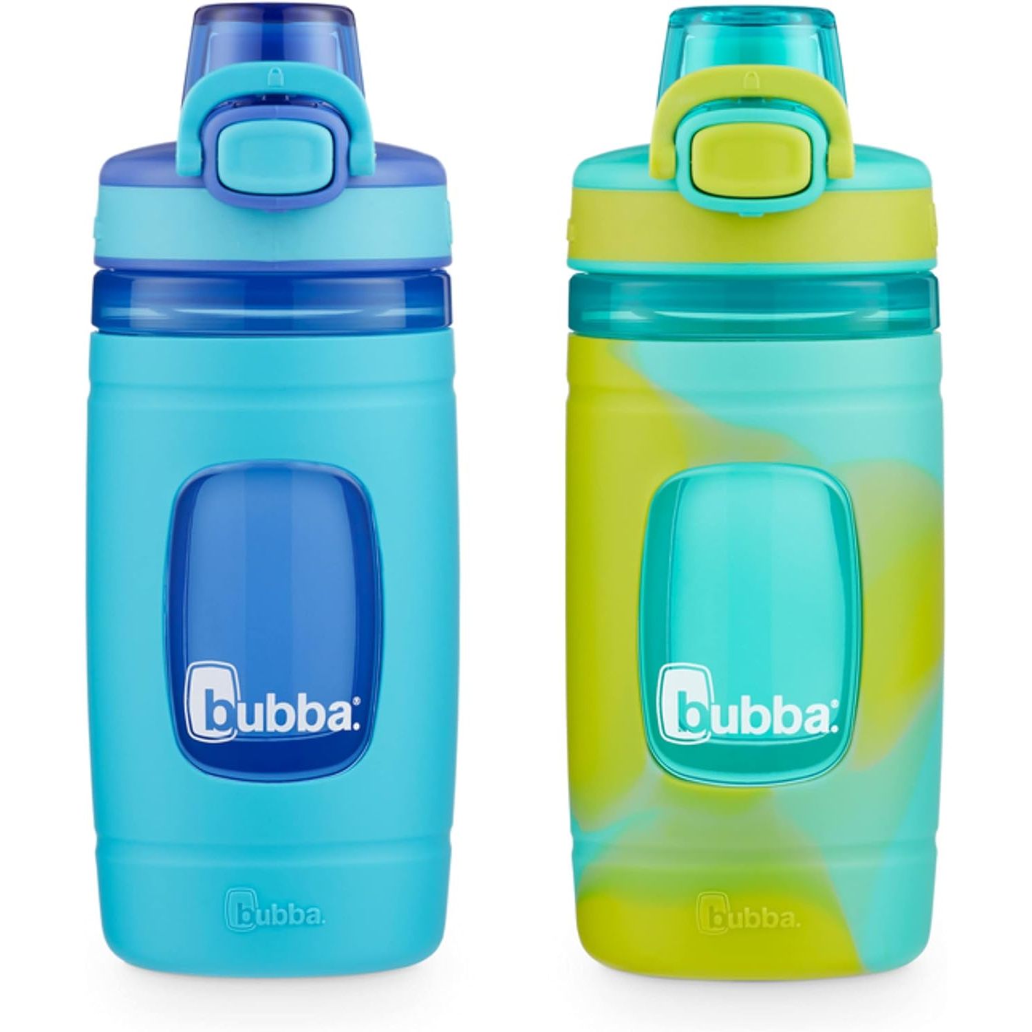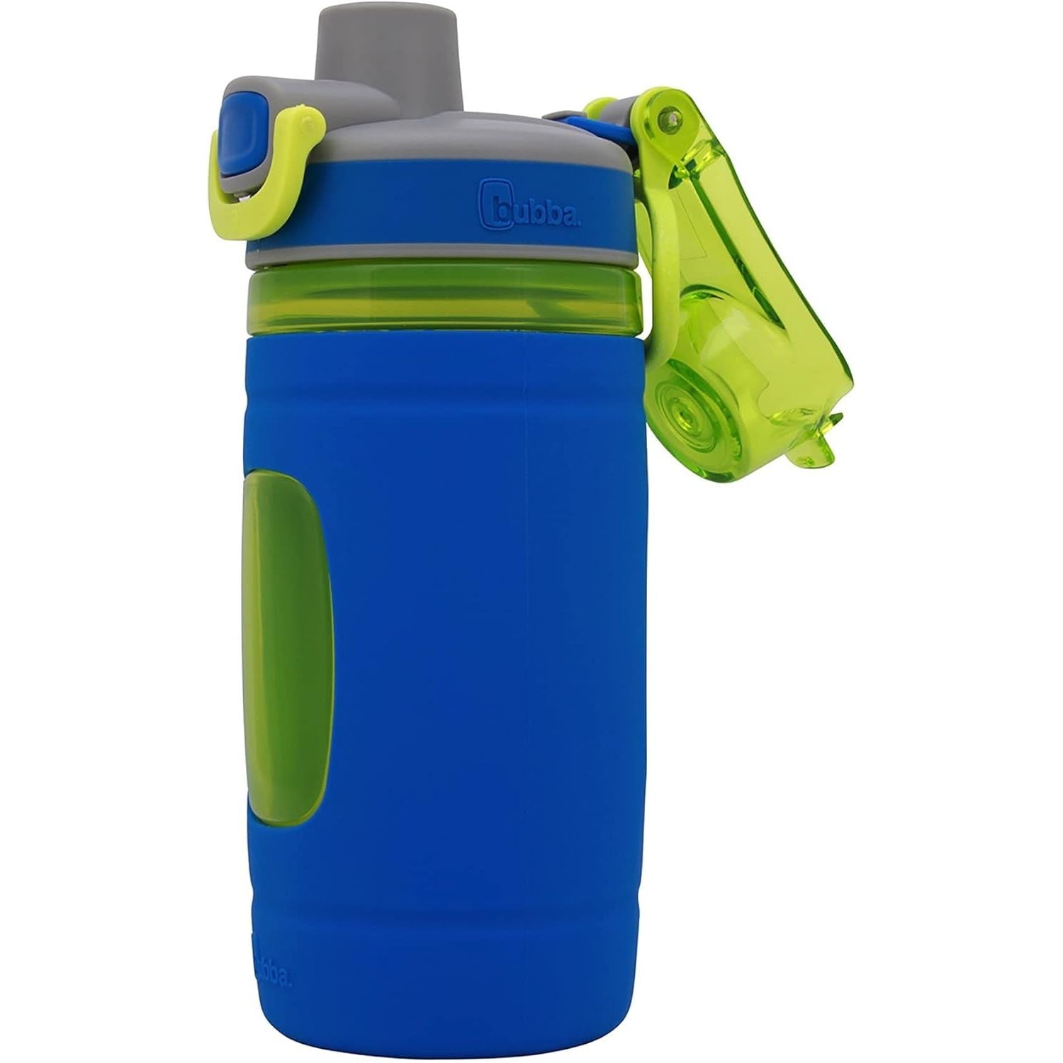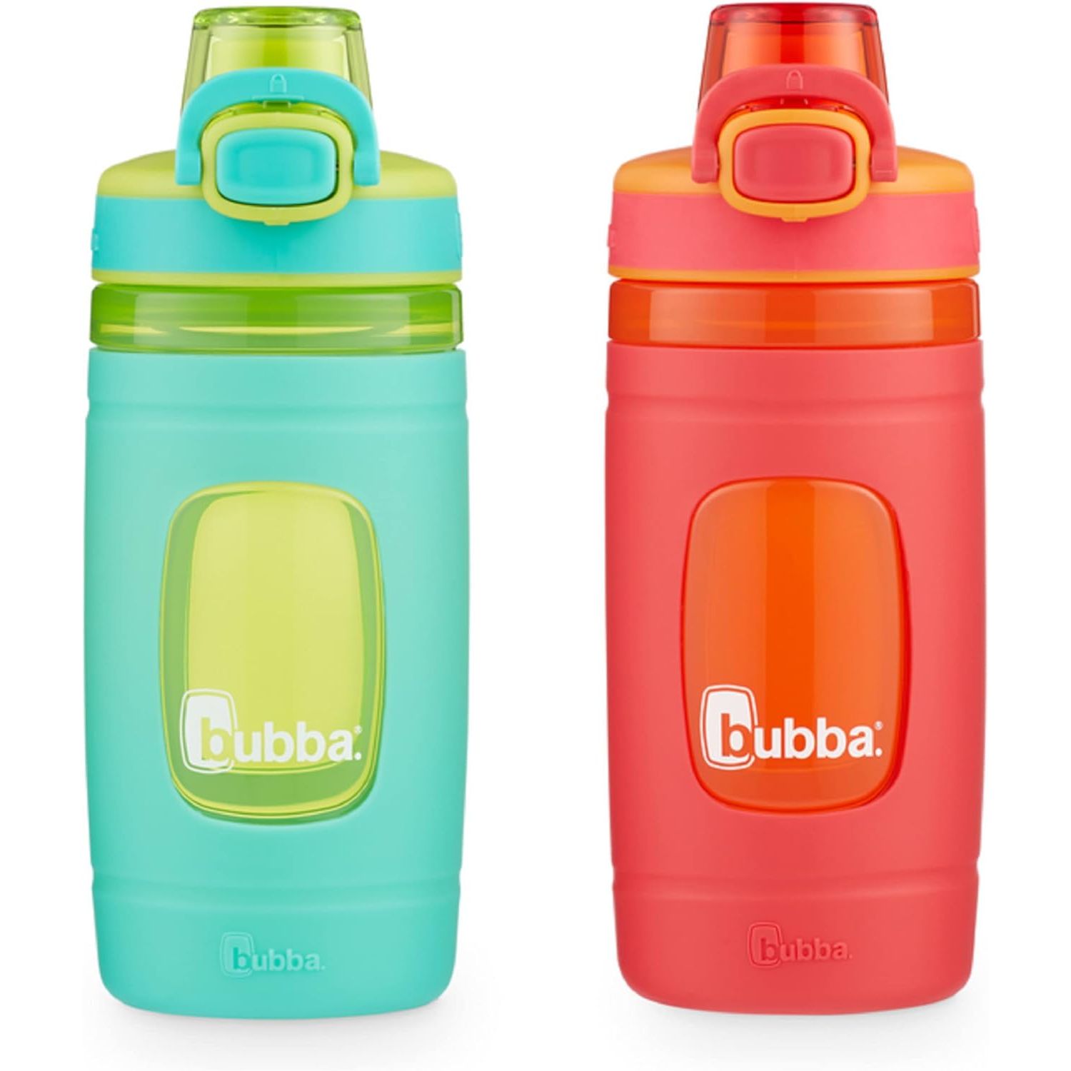 Teach your kids good hydration habits with the bubba Flo kids water bottle with silicone sleeve, 16 oz. It features a leak-proof lid and a handy button lock to prevent accidental openings, keeping the inside of your car safe from spills. With a high-flow Chug lid, kids can quickly Hydrate without missing their turn on the Monkey bars. A built-in spout cover keeps out dirt . This sturdy water bottle is made of impact-, stain-resistant BPA-free plastic. In addition to keeping drinks cold longer, the easy-to-grip silicone sleeve reduces condensation and includes a see-through window so you can track liquid consumption. The sleeve comes off, so throw lid and body onto the top rack of your dishwasher for no-fuss cleaning. Rest assured, your bubba is guaranteed for life. For ages 3 and up.
