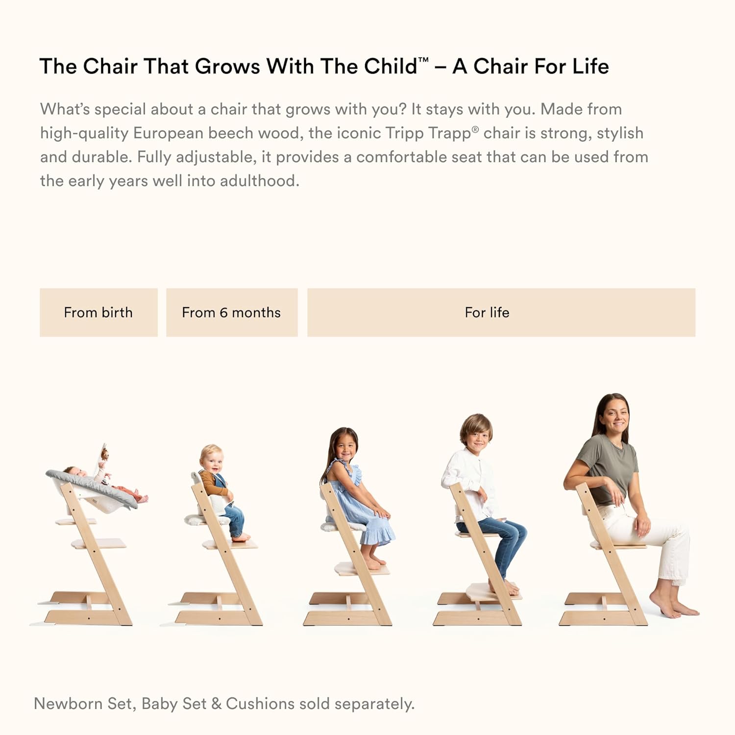 The Tripp Trapp Chair is a chair for life. The adjustable seat & footrest provide comfortable positions at any age, from newborns to adults.