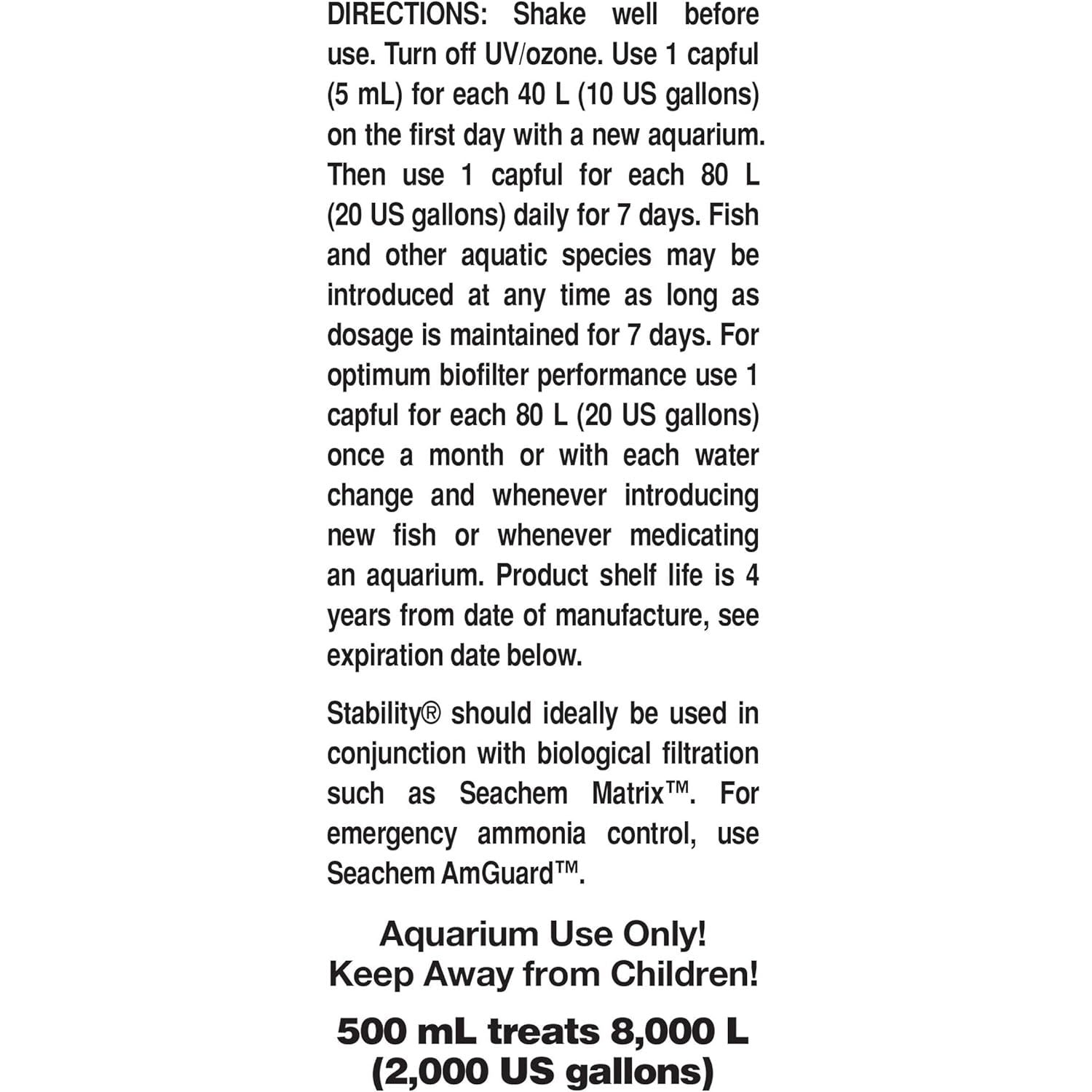 - USE: Shake Seachem Stability well before use and turn off UV/ozone filter. Use 1 capful (5 mL) for each 40 L (10 US gallons) on the first day with a new aquarium. Then use 1 capful for each 80 L (20 US gallons) daily for 7 days. Fish and other aquatic species may be introduced at any time as long as dosage is maintained for 7 days.