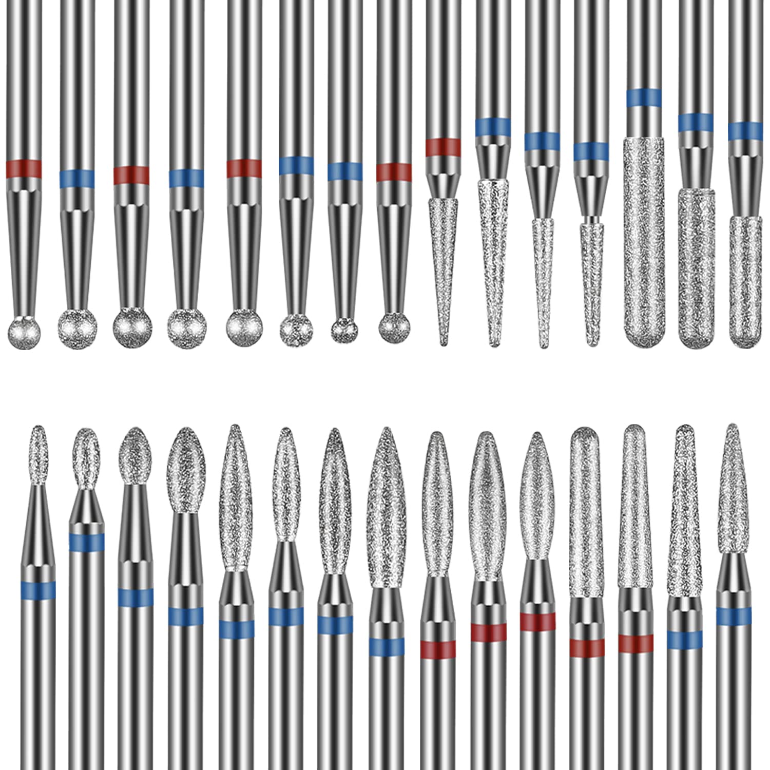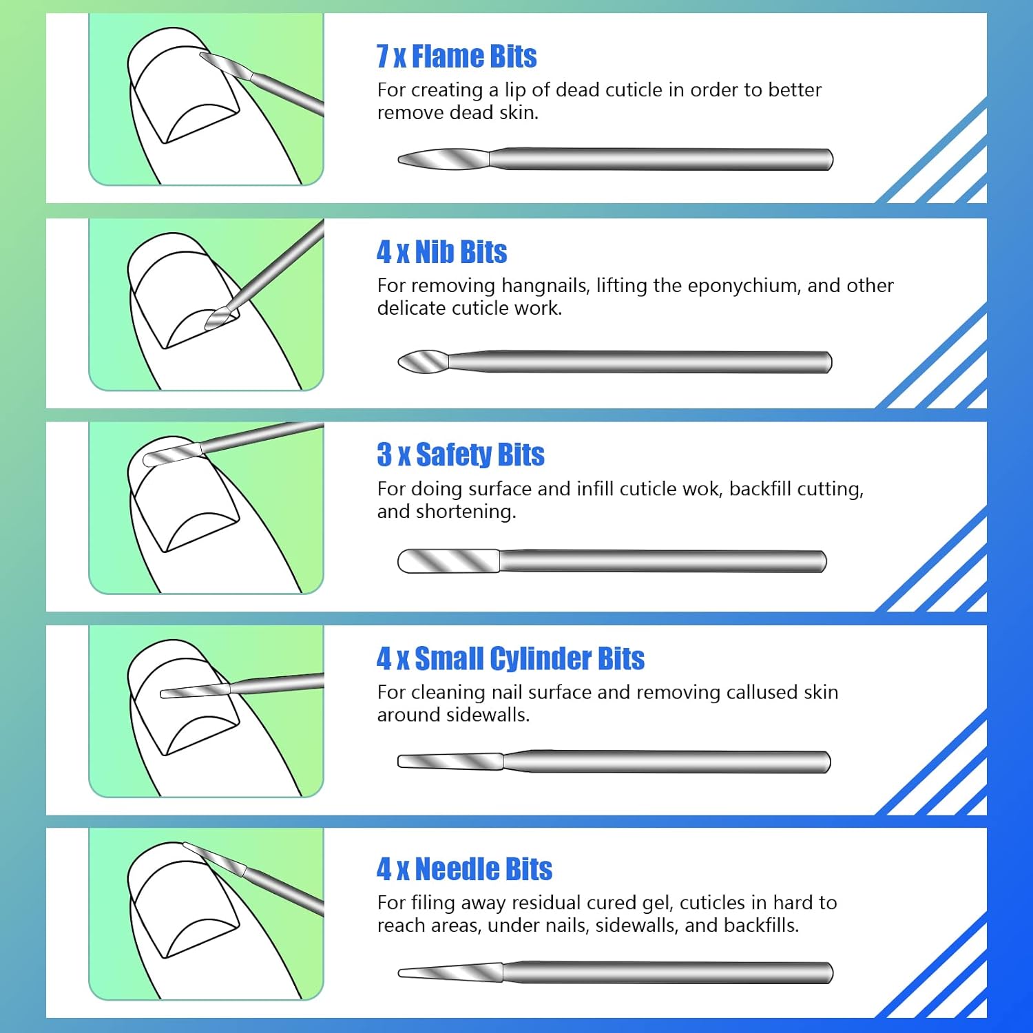 - 30-Piece Nail Drill Bits Set: 8 ball, 7 flame, 4 needle, 4 cylinder, 4 nib & 3 safety bits in medium & fine grits tackle cuticle work, shaping, debulking and clean-up in one kit