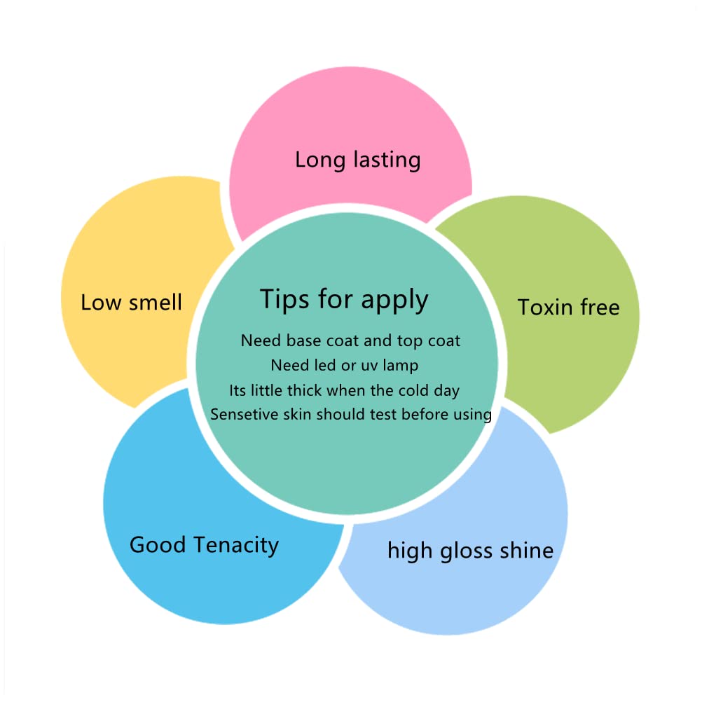 - Low Smell: The Gel Nail Polish is made of Natural Resin which is Harmless Resin, NON-TOXIC