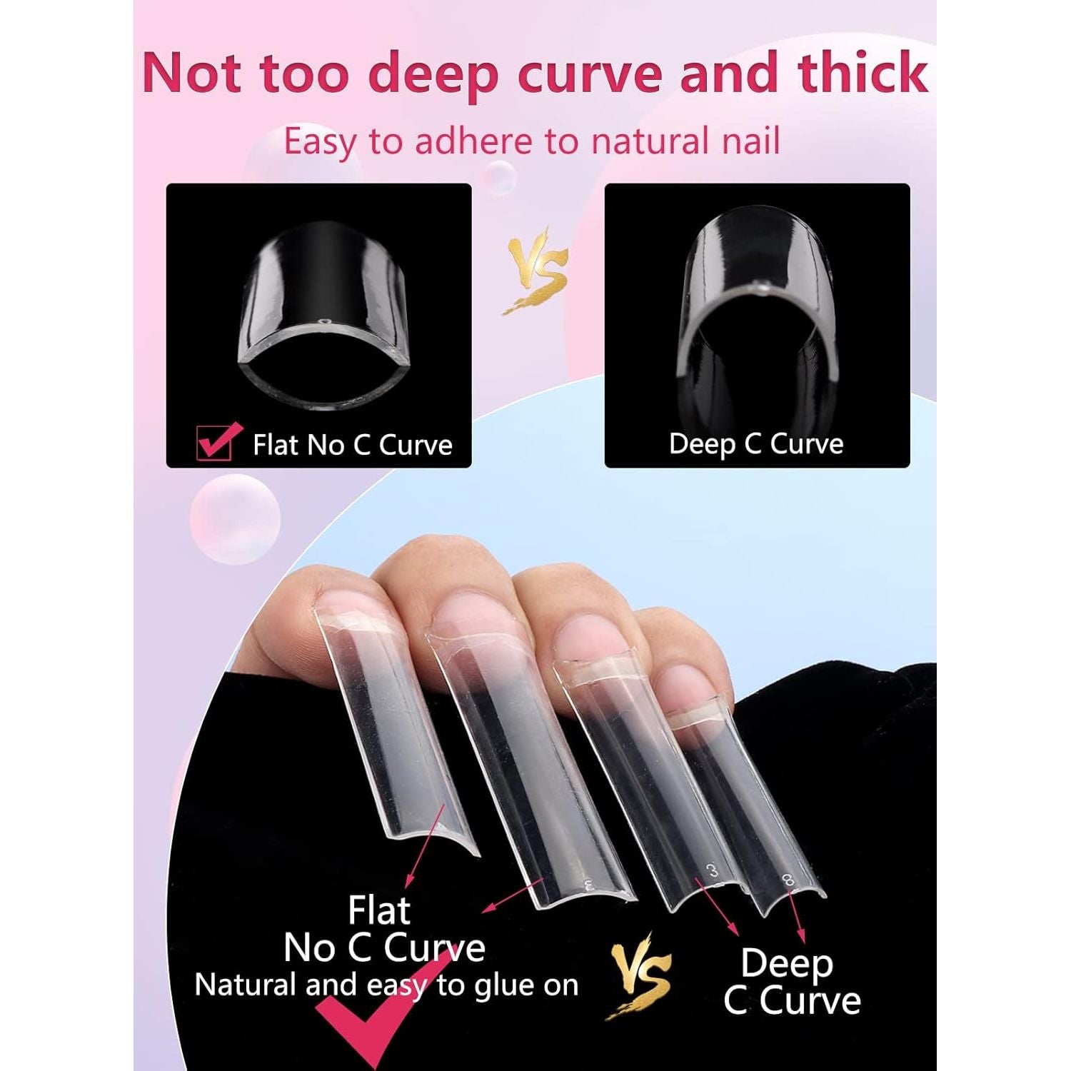 - Upgrade xxxl Nail Tips No C Curve- We have upgraded this newest flat Non c curve nails based on the feedback about the old basic c curve nail tips. Now it's very natural easy to shape, stick to the nail instantly, saves so much time for shaping and glue on. We had try our best to solve the problem of "the nail tip is too curve and thick, its very hard to glue to natural nail"