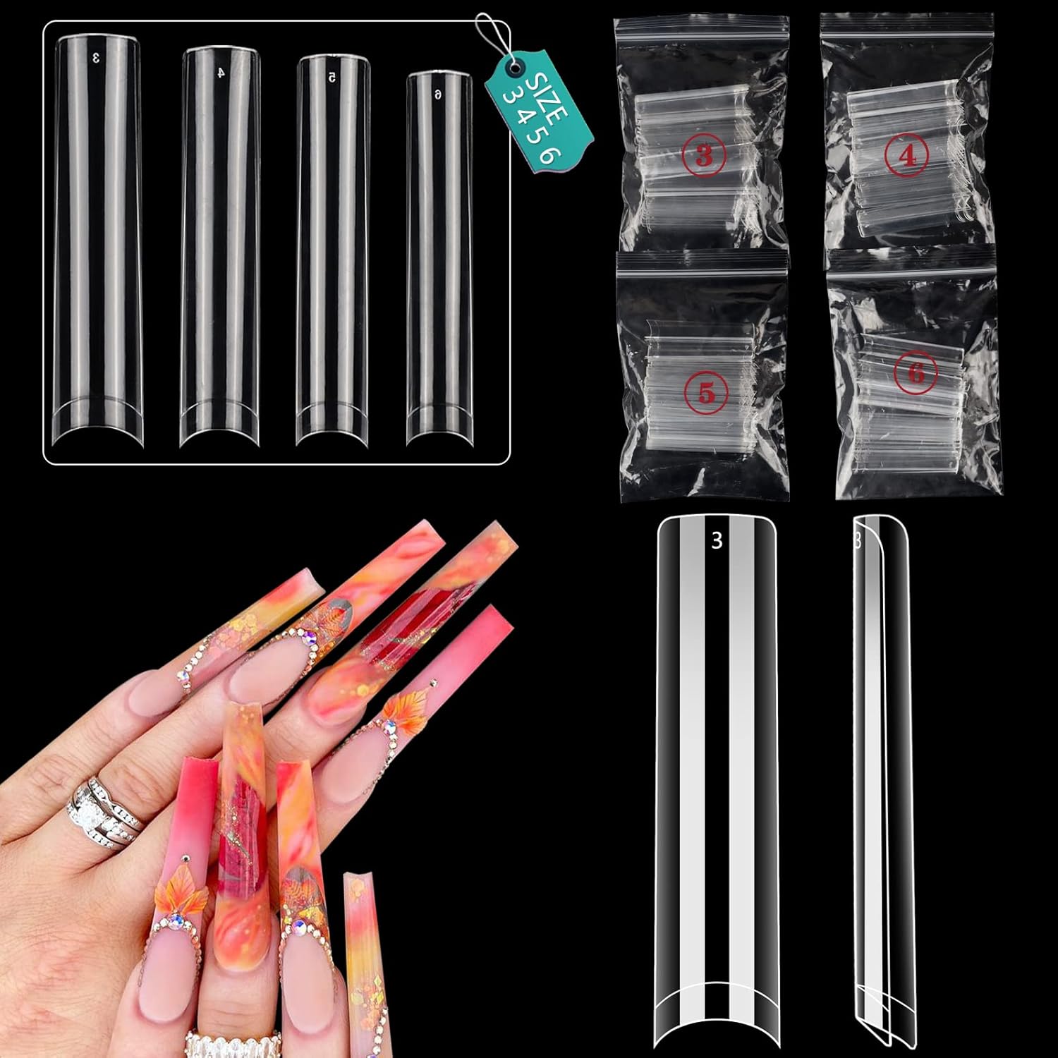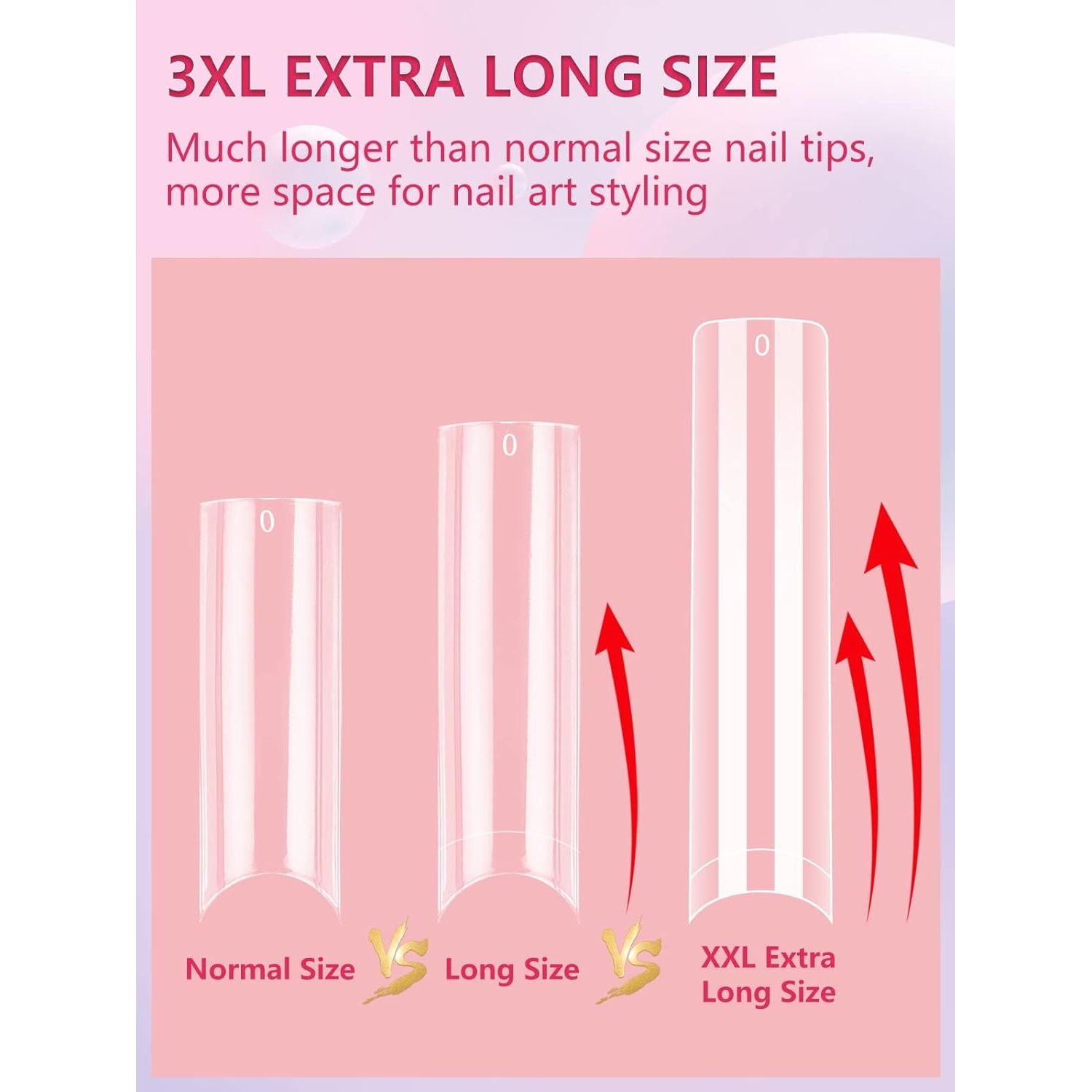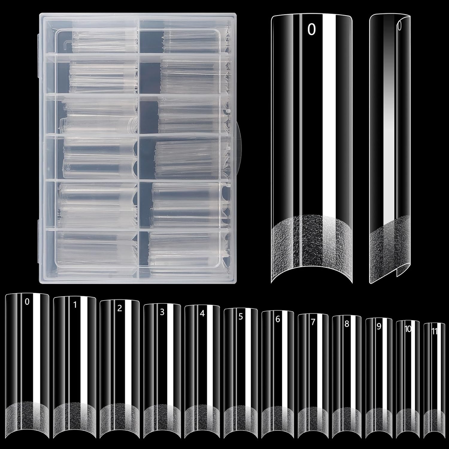 - Newest Extra Long Sizes- We improved this long nail tips not only on shape but also on sizes. The longest size is 2.17inch in length for size 0 and shortest lenght 1.85inch for size 11. It's much longer than other nail tips on the market. And there are 12 different sizes are pre-numbered 0-11 individually which that you can choose the suitable size conveniently, you also can shape it and cut the length easily according to your needs