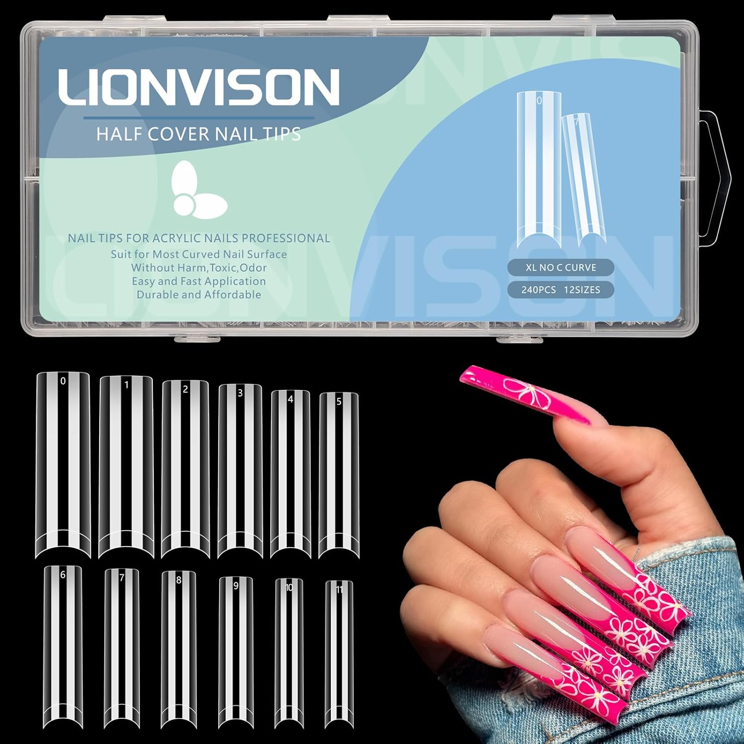 - LIONVISON 504PCS No C Curve Clear Nail Tips for Acrylic Nails Professional, 3XL Extra Long Flat Tapered Square Nail Tips, 12 Sizes Half Cover Straight French Fake Nail Tips for Nail Salons Home
