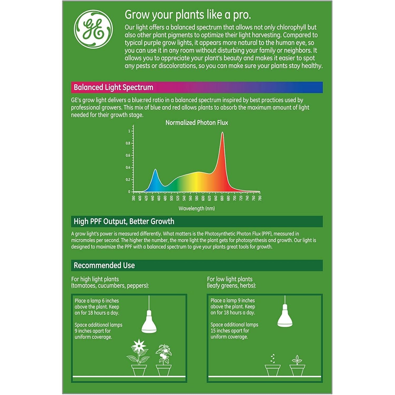 - Grow light bulbs for indoor plants: Now you can grow any variety of plants in your home. The GE Grow lights were carefully designed to give your plants the most light with a high output PPF of 16 micromoles per second.