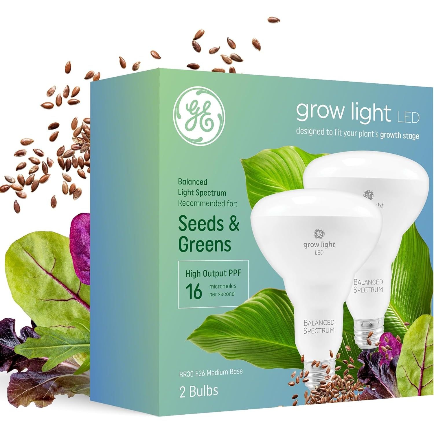 - GE Grow light with balanced light spectrum for seeds and greens: The GE BR30 grow bulbs appears white to the eye but have a red/blue light spectrum that is perfect for tomatoes, cucumbers, peppers, leafy greens and herbs.