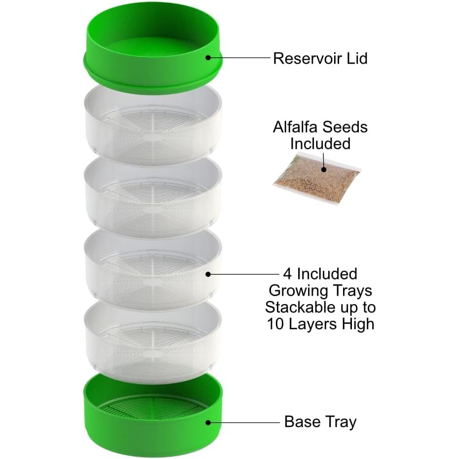 - STACKABLE TRAYS: Comes with four growing trays. Additional trays are available (sold separately) allowing you to stack growing trays up to 10 layers high ensuring you never run out of your favoite sprouts.