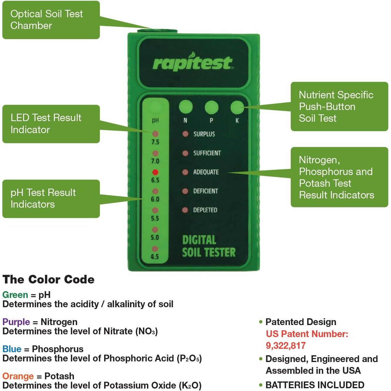 Electronic version of Luster Leaf’s popular 1601 Soil Test Kit. The rapitest Digital Soil Tester utilizes advanced LED digital technology and patent-pending optical calibration system to read test colors. The system is calibrated to read small color variations that can be difficult to distinguish with the human eye. The tester is easy to use. Just follow the easy instructions for each soil pH, nitrogen, phosphorus or potash tests; slide the test tube in optical chamber and push the appropriate button to get the test results. Once you have your soil test results, the tester booklet tells you how to adjust soil pH and provides recommendations for fertilizers. The booklet’s pH preference list allows you to select plants for your soil’s pH or know how much to adjust the soil pH for your current plants.