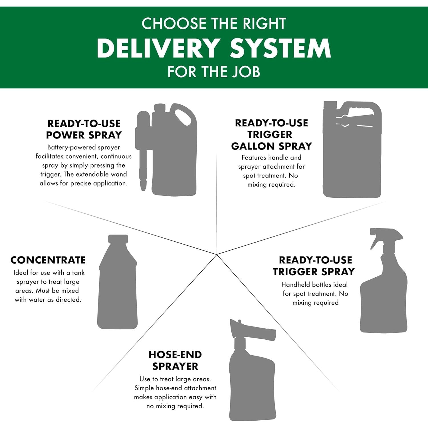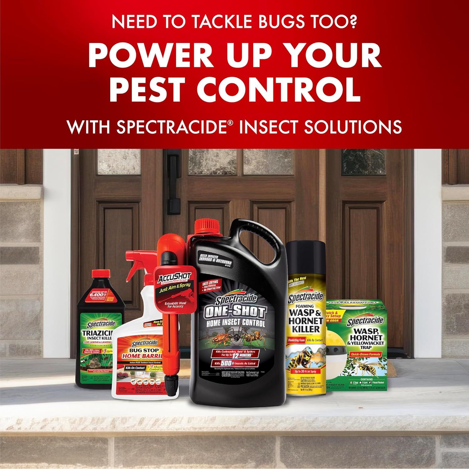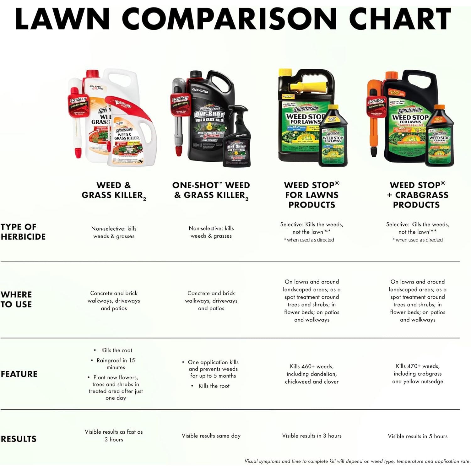 The power is in your hands to keep your landscape in line – unleash it with Spectracide lawn and garden products. Our easy-to-use, fast-acting insect, lawn disease and weed control solutions help you tame lawn and landscape invaders with incredible pest-punishing power. Take command with Spectracide brand. You hold the power. Spectracide Weed Stop For Lawns Plus Crabgrass Killer Concentrate controls more than 250 types of weeds as listed – and it won’t harm your lawn when used as directed. This concentrate formula kills on contact all the way down to the root, with visible results in 8 hours. It controls major broadleaf and troublesome grass weeds, including dandelion, chickweed and clover, as well as crabgrass, foxtail and yellow nutsedge (see product label for complete list). This product is rainfast within 3 hours, so it won’t wash off. Apply Spectracide Weed Stop For Lawns Plus Crabgrass Killer Concentrate when temperatures are between 45 and 90 degrees. Some hard-to-kill weeds may require re-treatment. Wait at least 30 days between applications — some weeds can take that long to die. Read the entire label before using. This comes in a concentrate and a ready-to-spray. Limit to two spot treatments per year.