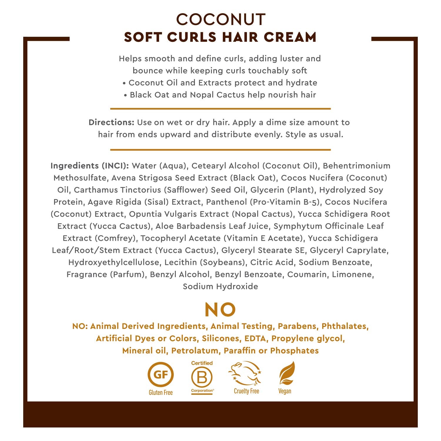 - Ethical and Sustainable: Vegan, gluten-free, and cruelty-free, Desert Essence Coconut Soft Curls Hair Cream is made in the USA with responsibly sourced ingredients. Free from SLS and artificial dyes, it’s a safe and eco-friendly choice for gorgeous hair.