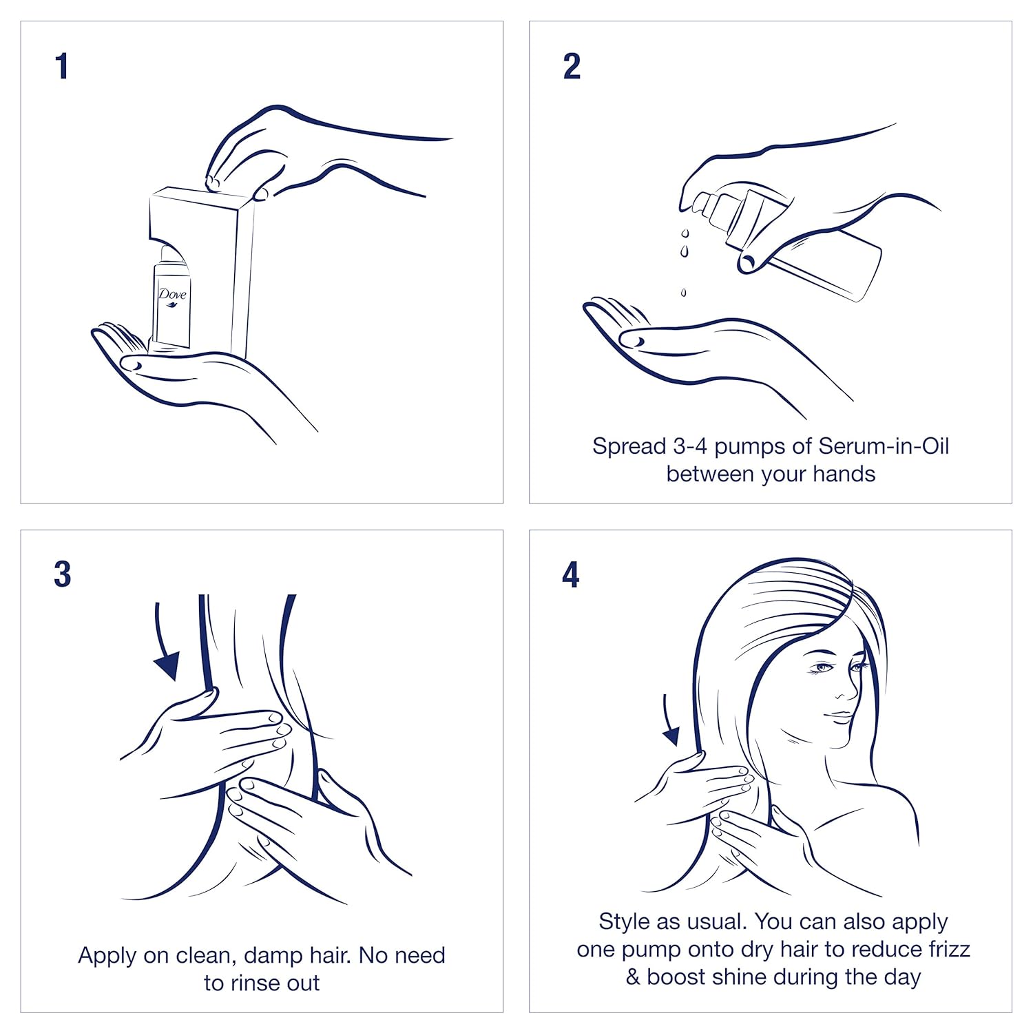 Blow dry, straighten, curl or color.... No matter what you do to your hair to be you, we believe damage should never hold you back. So if you've been wondering how to treat damaged hair, we've got just the thing: NEW Dove Advanced Hair Series Regenerative Nourishment Serum in Oil. Through expert selection and blending this innovative product brings together the nourishing power of our oil for damage hair along with the serum's restorative qualities to create one potent Serum-in-Oil super formula. This ultimate Dove hair savior instantly rescues the healthy appearance of extremely damaged hair making it shiny and soft, while also strengthening and preventing split ends. More than repair, nourishment that regenerates. UNVEIL REGENERATED HAIR: HEALTHY LOOKING, STRONG, SMOOTH & MANAGEABLE HAIR. How to use: dispense 3-4 pumps of Serum-In-Oil into your hands and rub your palms together before applying evenly through the lenses of clean, damp hair. Style as usual and don't rinse it out. You can also apply one pump onto dry hair to reduce frizz and boost shine during the day. Suitable for daily use. For best results, use in combination with Dove Advanced Hair Series Regenerative Nourishment Shampoo and Dove Advanced Hair Series Regenerative Nourishment Conditioner.