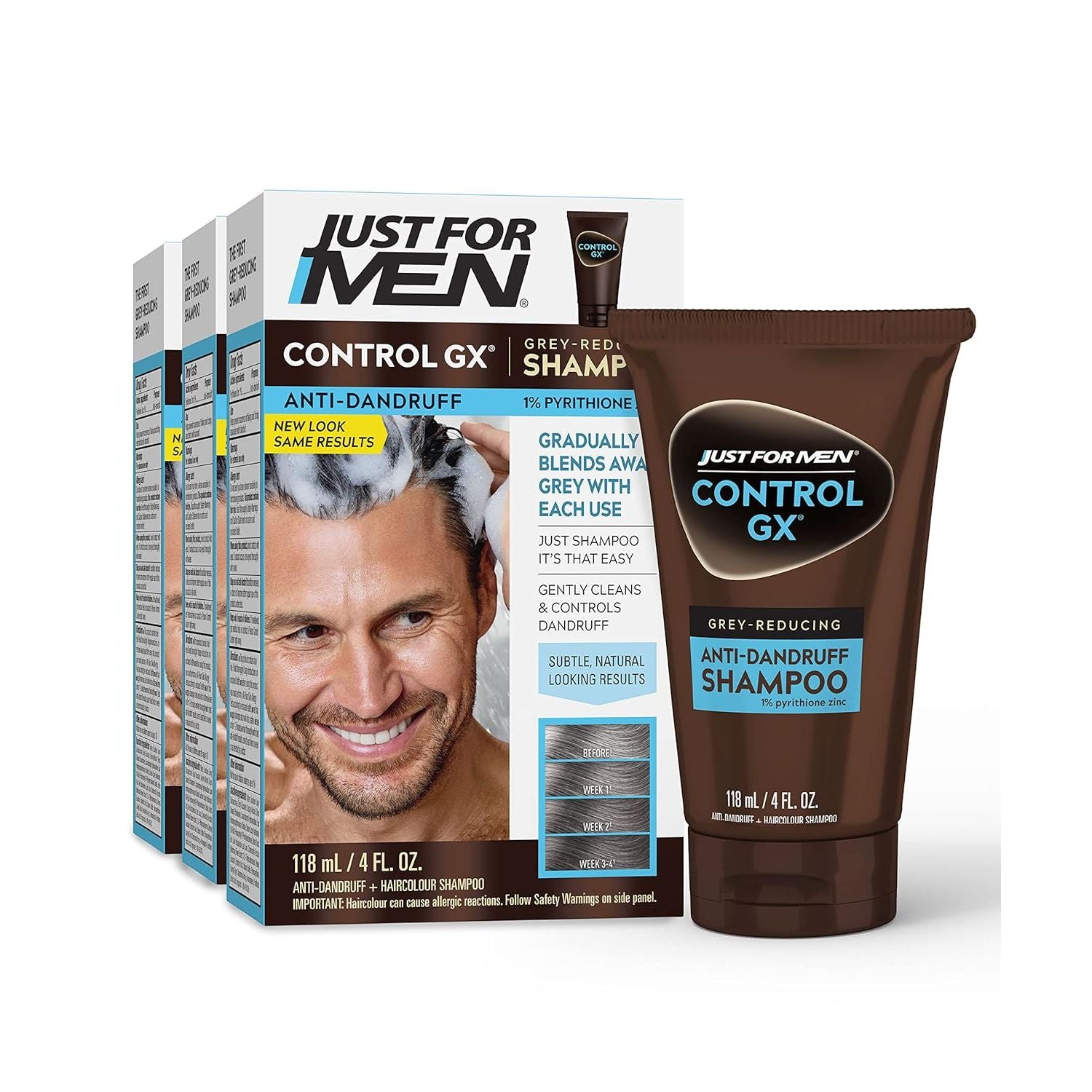 Control GX is the first and only shampoo smart enough to gradually reduce greys by slowly bringing them back to their natural shade while it cleanses and conditions your hair. You get an extremely natural look - just by shampooing as you normally do. Just use it instead of your usual shampoo until you like what you see. Then use it in rotation with your usual shampoo to maintain the look you like. There's never been an easier way to control your grey. Get the look you want: Use the control GX as your daily shampoo, and after the first few washes, you'll start to see a subtle reduction in the amount of gray. Continue to use it until you reach your desired level of grey reduction (generally within 2 to 4 weeks). You can even control how gradually you get to your desired result by using it daily or every other day at the start. Keep it that way: Once you've reached the level of grey reduction you like, you can reduce the frequency of use, alternating with another shampoo. In general guys use it as their daily shampoo at the start, and when they are in "maintenance mode" they use it 3 to 4 times a week.
