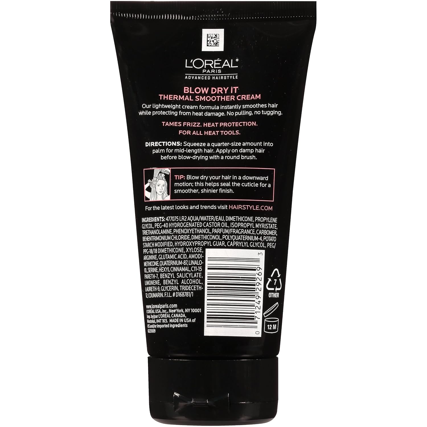 Put an end to frizzy hair days and tame frizz with L'Oreal Paris AHS BLOW DRY IT Thermal Smoother Cream. This lightweight styling cream and hair protectant instantly tames and protects hair from any heat tool, leaving all hairstyles smooth and full of shine. Suitable for long hairstyles, medium length hairstyles, and short hairstyles. Instantly smoothes and protects Tames frizz No pulling, no tugging Heat Protection Squeeze a quarter-size amount into palm for mid-length hair. Apply on damp hair before blow-drying with a round brush. TIP: Blow dry your hair in a downward motion; this helps seal the cuticle for a smoother, shinier finish.