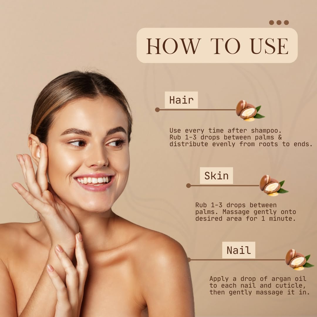 Welcome our Argan Oil's versatility: it conditions hair and scalp daily, bringing natural radiance while nourishing the scalp. For nails and cuticles, it fortifies and moisturizes, promoting strong, polished nails. As a daily skin moisturizer, revel in its non-greasy texture, leaving skin supple and hydrated. Your all-in-one for everyday beauty needs.
