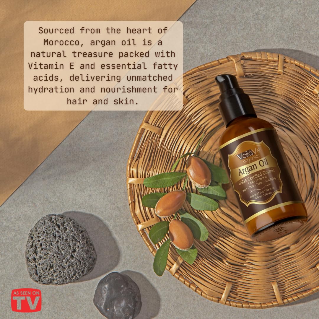 VoilaVe USDA and ECOCERT 100% Pure Organic Moroccan Argan Oil for Skin, Nails & Hair Growth, Anti-Aging Face Moisturizer, Cold Pressed, Hair Moisturizer, Rich in Vitamin E, As Seen On TV - 4 fl oz