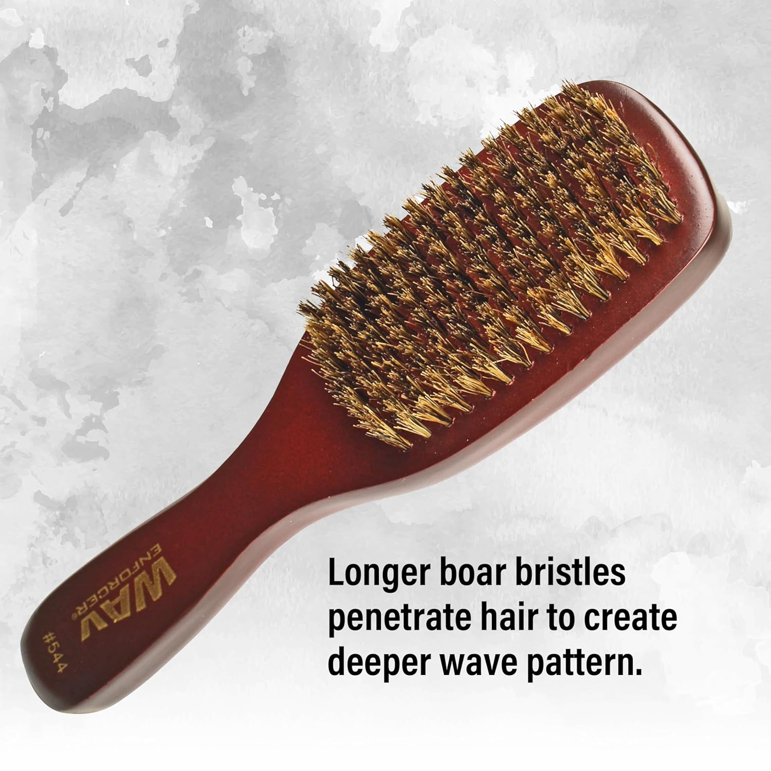 Wav Enforcer spin 100% pure boar bristle wave brush is designed to style low to medium length cuts, waves and fades. The deep, firm boar bristles, designed for thicker hair, stimulates the scalp, enforces waves and distributes natural oils throughout the hair. The long handle allows for easy gripping and use.