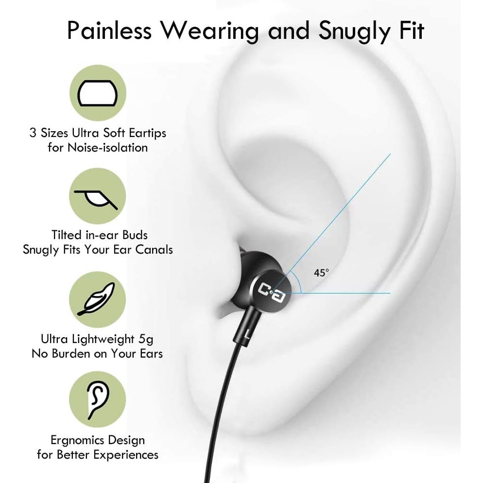 - UPDATED 2021: Refer to user's feedback, we've made some important improvements: 1) The buds are changed from straight to the tilted shape for secure wearing, no falling off anymore! 2) The microphone and hands-free botton are built-in for great convenience. 3) The length of coiled cord is increased by 50cm (20 inches) longer, now it can be extended to 12 feet very easily.