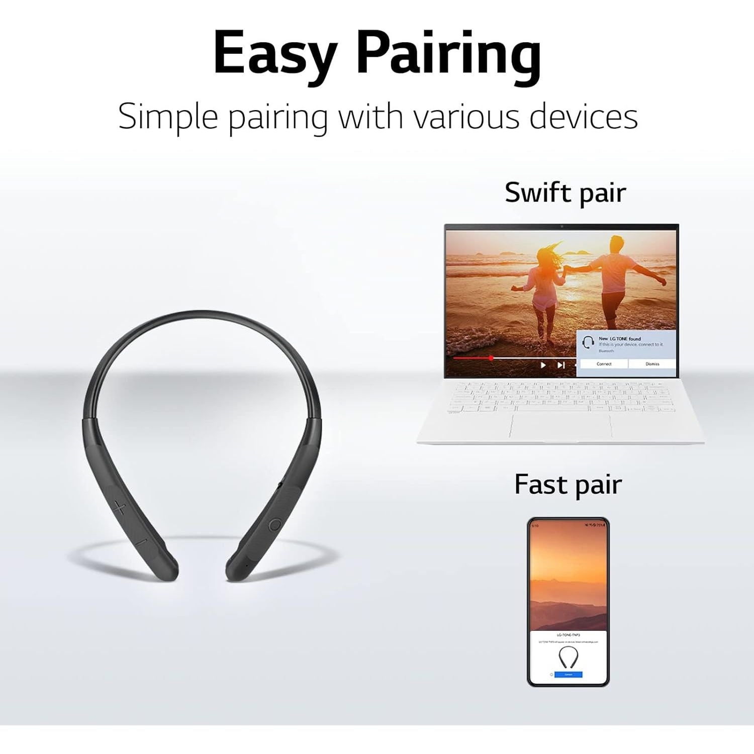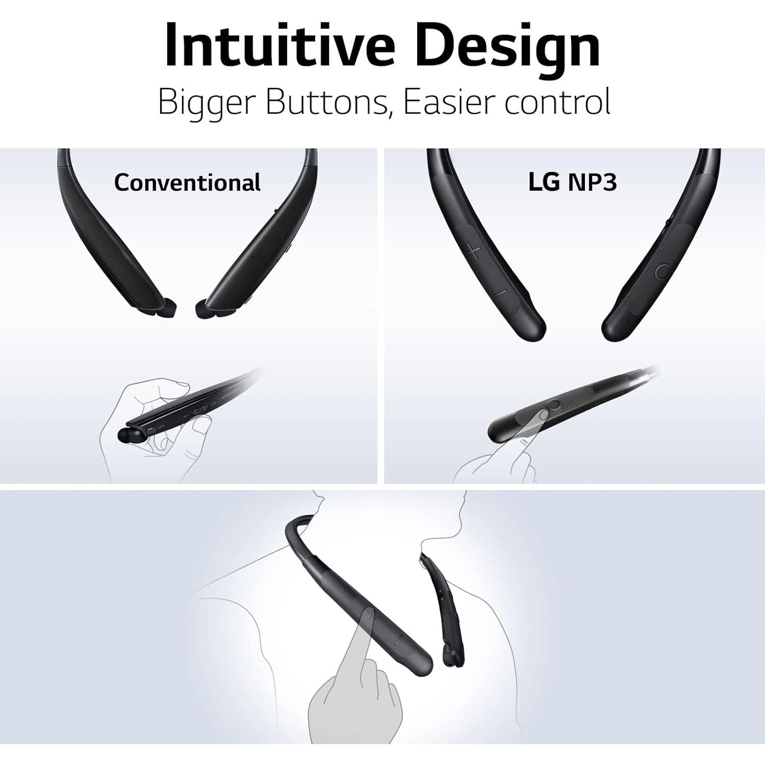 LG'S TONE NP3 Wireless Headphones are made for the way you live. Whether for work or play, this Bluetooth wireless headset with retractable earbuds makes a comfortable companion, even for rugged use with a memory-shaping neckband, wider controls, and up to 22 hours of playtime.* *Based on playback at 50% volume. Play time and charging time may vary depending on usage.