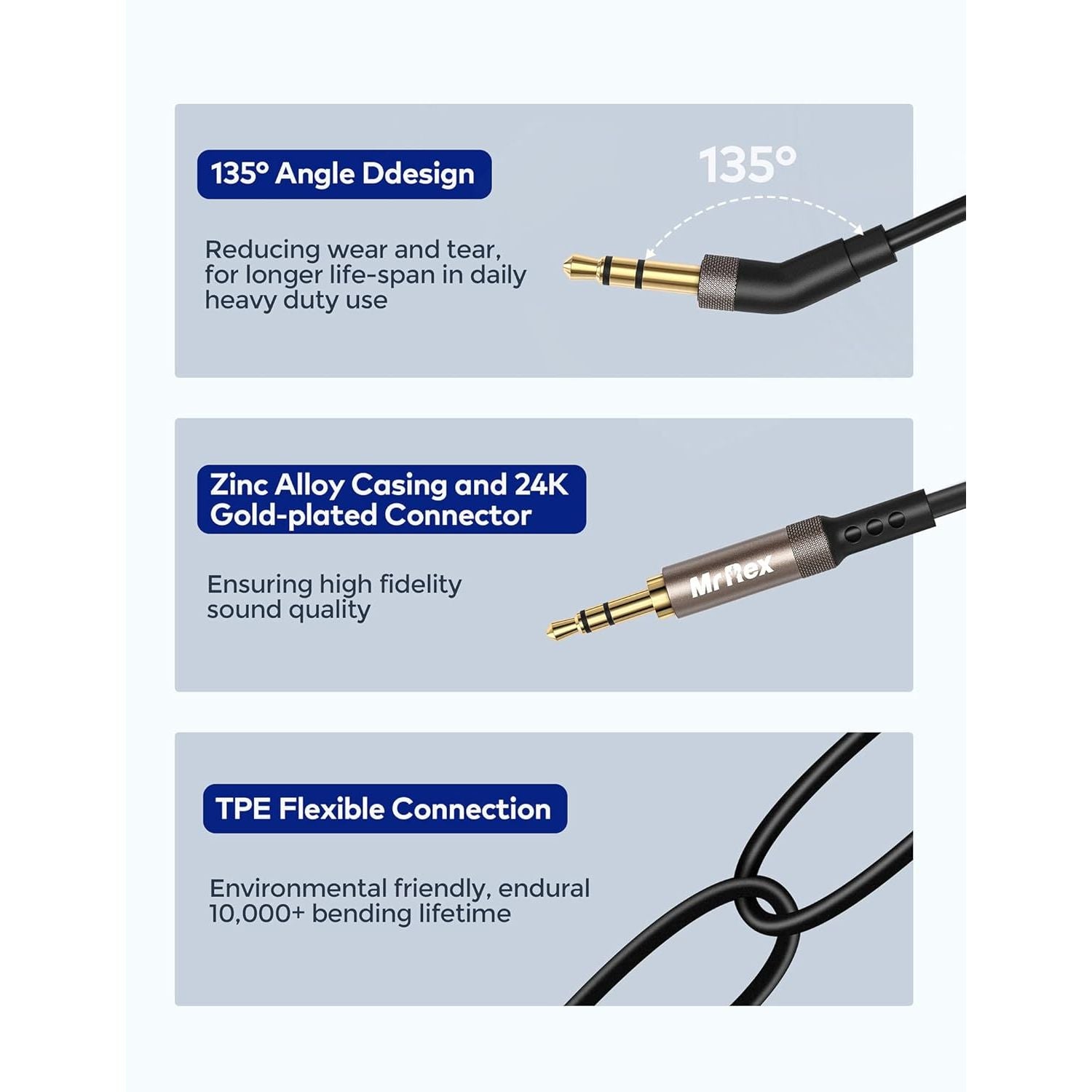 - High quality material for clear stereo sound. Mr Rex stereo audio cable is made of Oxygen-free copper and 24K gold-plate connector, ensuring high fidelity sound quality and providing maximum's durability. 135 degree angle reducing tear and wore. Special degree design, metal connector and dual-layer connector cover for longer life-span in daily heavy duty use.