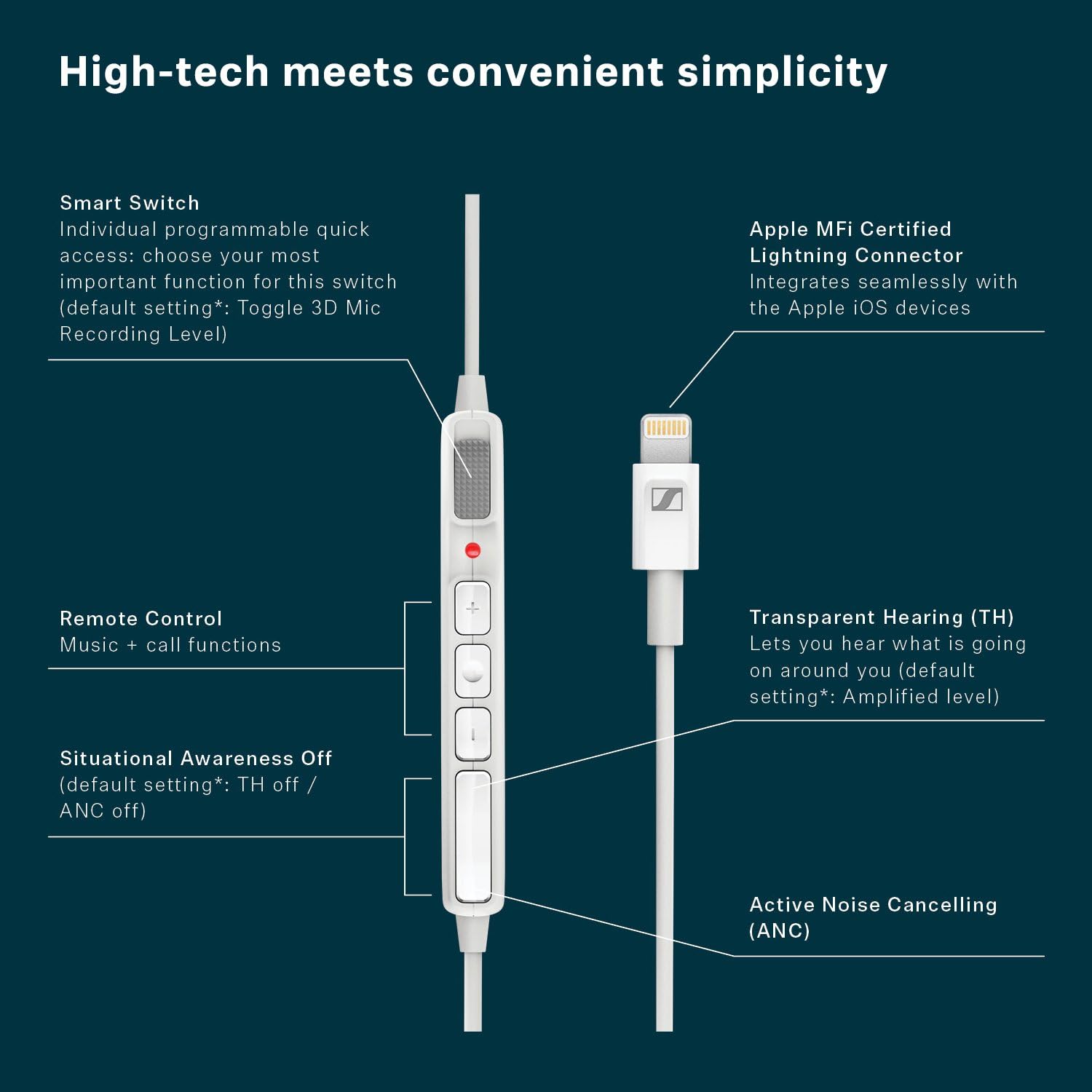 - All-in-one Headset: In-Ear Canal headphones with Lightning connector. Features high quality music listening, transparent hearing mode, Active Noise Cancellation, 3D sound recording, immersive playback and crystal clear voice calls.