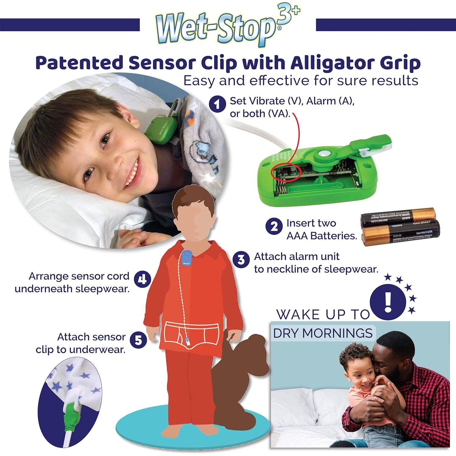 The Wet-Stop 3+ alarm consists of a small, light-weight alarm unit, only 1-3/4" wide x 2-3/4" long x 3/4" thick (AAA battery powered), with an attached rotating alligator grip. A thin cable with a sensor in the tip is plugged into the alarm unit, and the alarm unit is attached to pajamas near the ear to be heard. Pass the cord under the pajamas to the outside of the underwear. The sensor clip uses a strong alligator grip to attach to underwear in the area where urine will first be deposited. The sensor clip should not be placed next to skin, as the sensor is sensitive enough to alert to sweat or excess skin moisture.